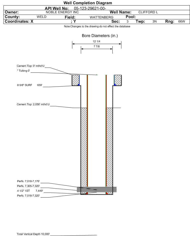 Wellbore #00 Wellbore Classification: GW Status: AB - 3/13/2024 Measured TD: 7469 ft.| Wellbore Data for Original Wellbore | Wellbore Classification: GW AB - 3/13/2024 | | Wellbore Permit | | | Permit #: | 20086901 | Expiration Date: | 12/8/2009 | | Proposed Depth/Form: | 7950 ft. | | Surface Mineral Owner Same: | No | | Mineral Owner: | FEE | Surface Owner: | FEE | | Unit: | | Unit Number: | | | Formation And Spacing: | Code: CODL , Formation: CODELL , Order: 407-87 , Unit Acreage: 160, Drill Unit: GWA | | Formation And Spacing: | Code: JSND , Formation: J SAND , Order: , Unit Acreage: 160, Drill Unit: GWA | | Formation And Spacing: | Code: NBRR , Formation: NIOBRARA , Order: 407-87 , Unit Acreage: 160, Drill Unit: GWA |