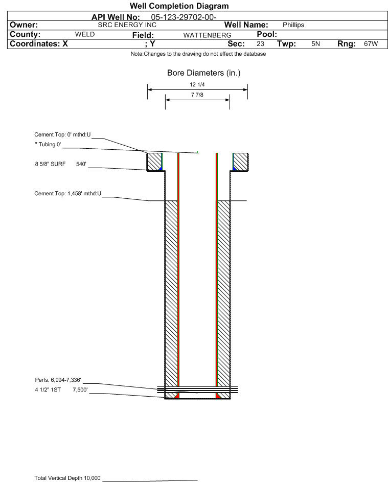 | Wellbore Completed | | Completion Date: | 6/12/2011 | | Spud Date: | 6/8/2011 | Spud Date Is: | ACTUAL | | Measured TD: | 7510 ft. | Measured PB depth: | 7456 ft. | | True Vertical TD: | | True Vertical PB depth: | | | Top PZ Location: | Sec:23 Twp: 5N 67W | Footage: 75 FNL 1316 FEL | | Bottom Hole Location: | Sec:23 Twp: 5N 67W | Footage: 75 FNL 1316 FEL | | Log Types: | CBL/GRL/CCL, CDL/CNL/ML, HRIL. | | Casing: | String Type: SURF, Hole Size: 12.25 in., Size: 8.625 in., Top: 0 ft., Depth: 540 ft., Weight: 24 , Citings Type: ACTUAL | | Cement: | Sacks: 188, Top: 0 ft., Bottom: 540 ft., Determination Method: VISU | | Casing: | String Type: 1ST, Hole Size: 7.875 in., Size: 4.5 in., Top: 0 ft., Depth: 7500 ft., Weight: 11.6 , Citings Type: ACTUAL | | Cement: | Sacks: 635, Top: 1572 ft., Bottom: 7500 ft., Determination Method: CBL | | Formation | Interval Top | Log Bottom | Cored | DSTs | | NIOBRARA | 6973 ft. | | | | | FORT HAYS | 7290 ft. | | | | | CODELL | 7312 ft. | | | |