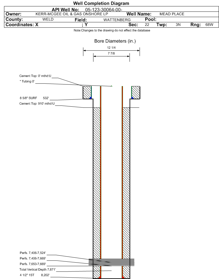 Wellbore #00 Wellbore Classification: OW Status: AB - 10/28/2024 Measured TD: 8215 ft. Vertical TD: 7871 ft.| Wellbore Data for Original Wellbore | Wellbore Classification: OW AB - 10/28/2024 | | Wellbore Permit | DIRECTIONAL | | Permit #: | 20090358 | Expiration Date: | 2/16/2010 | | Proposed Top PZ Location: | Sec: Twp: | Footage: 660 FSL 1980 FEL | | Bottom Hole Location: | Sec:22 Twp: 3N 68W | Footage: 660 FSL 1980 FEL | | Proposed Depth/Form: | 8261 ft. | | Surface Mineral Owner Same: | No | | Mineral Owner: | FEE | Surface Owner: | FEE | | Unit: | | Unit Number: | | | Formation And Spacing: | Code: JSND , Formation: J SAND , Order: 232 , Unit Acreage: 320, Drill Unit: S2 | | Formation And Spacing: | Code: NB-CD , Formation: NIOBRARA-CODELL , Order: 407 , Unit Acreage: 80, Drill Unit: S2SE4 |
