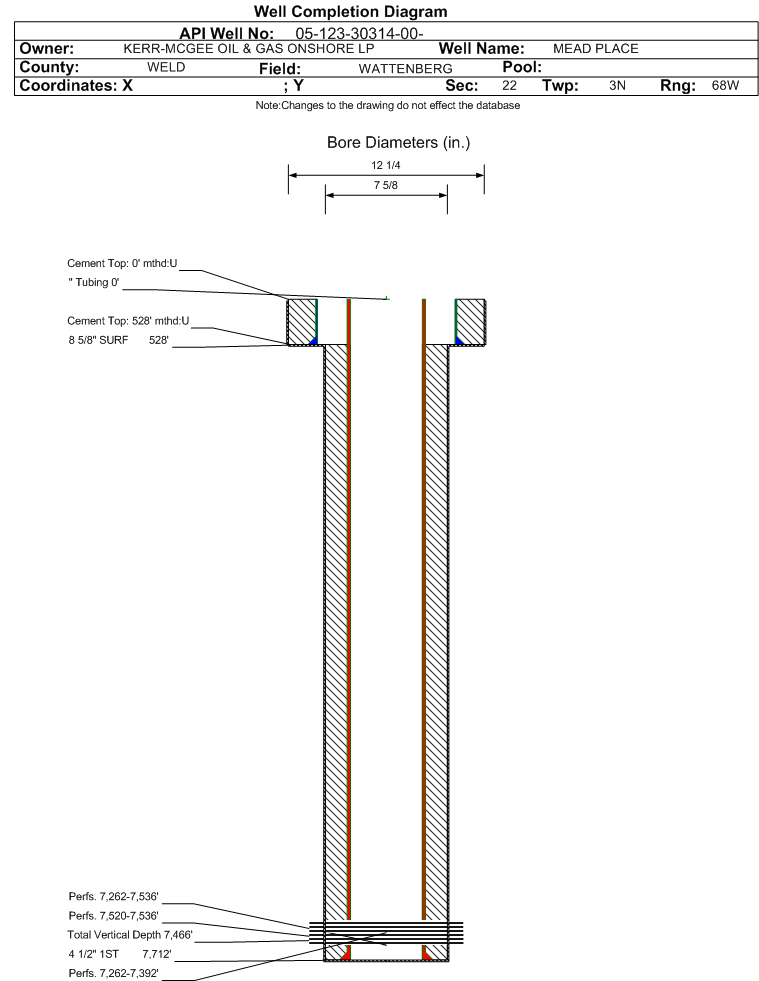 Wellbore #00 Wellbore Classification: OW Status: AB - 10/28/2024 Measured TD: 7725 ft. Vertical TD: 7466 ft.| Wellbore Data for Original Wellbore | Wellbore Classification: OW AB - 10/28/2024 | | Wellbore Permit | DIRECTIONAL | | Permit #: | 20090350 | Expiration Date: | 4/20/2010 | | Proposed Top PZ Location: | Sec: Twp: | Footage: 1280 FSL 50 FWL | | Bottom Hole Location: | Sec:22 Twp: 3N 68W | Footage: 1280 FSL 50 FWL | | Proposed Depth/Form: | 7694 ft. | | Surface Mineral Owner Same: | No | | Mineral Owner: | FEE | Surface Owner: | FEE | | Unit: | | Unit Number: | | | Formation And Spacing: | Code: NB-CD , Formation: NIOBRARA-CODELL , Order: 407 , Unit Acreage: 160, Drill Unit: GWA |