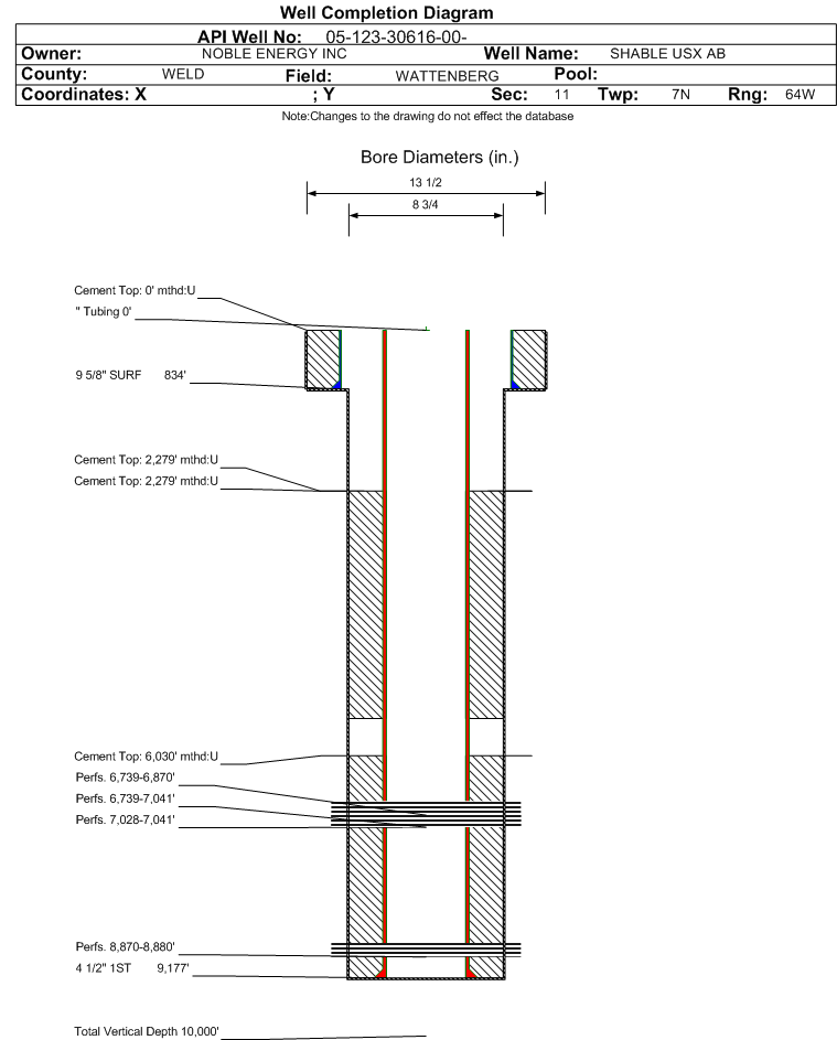 Wellbore #00 Wellbore Classification: OW Status: PA - 7/16/2018 Measured TD: 9186 ft.| Wellbore Data for Original Wellbore | Wellbore Classification: OW PA - 7/16/2018 | | Wellbore Permit | | | Permit #: | 20092713 | Expiration Date: | 9/26/2011 | | Proposed Depth/Form: | 7000 ft. | | Surface Mineral Owner Same: | No | | Mineral Owner: | FEE | Surface Owner: | FEE | | Unit: | | Unit Number: | | | Formation And Spacing: | Code: CODL , Formation: CODELL , Order: , Unit Acreage: 80, Drill Unit: N2NE4 | | Formation And Spacing: | Code: LYNS , Formation: LYONS , Order: , Unit Acreage: 640, Drill Unit: ALL | | Formation And Spacing: | Code: NBRR , Formation: NIOBRARA , Order: , Unit Acreage: 80, Drill Unit: N2NE4 | | Casing: | String Type: SURF, Hole Size: 12.25 in., Size: 8.625 in., Top: , Depth: 750 ft., Weight: 36 , Citings Type: PLANNED | | Cement: | Sacks: 305, Top: 0 ft., Bottom: 750 ft. | | Casing: | String Type: 1ST, Hole Size: 8.75 in., Size: 7 in., Top: , Depth: 9150 ft., Weight: 26 , Citings Type: PLANNED | | Cement: | Sacks: 622, Top: , Bottom: 9150 ft. |