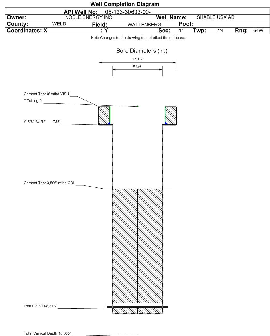 | Wellbore Completed | | Completion Date: | 4/2/2010 | | Spud Date: | 3/23/2010 | Spud Date Is: | ACTUAL | | Measured TD: | 9100 ft. | Measured PB depth: | 5590 ft. | | True Vertical TD: | | True Vertical PB depth: | | | Bottom Hole Location: | Sec:11 Twp: 7N 64W | Footage: 610 FNL 610 FWL | | Log Types: | CBL/VDL/GRL/CCL, SDL/DSNL/ACL/TRL | | Casing: | String Type: SURF, Hole Size: 13.5 in., Size: 9.625 in., Top: 0 ft., Depth: 785 ft., Weight: 36 , Citings Type: ACTUAL | | Cement: | Sacks: 309, Top: 0 ft., Bottom: 785 ft., Determination Method: VISU | | Casing: | String Type: 1ST, Hole Size: 8.75 in., Size: , Top: 0 ft., Depth: 9058 ft., Weight: 26 , Citings Type: ACTUAL | | Cement: | Sacks: 780, Top: 1178 ft., Bottom: 9058 ft., Determination Method: CBL | | Formation | Interval Top | Log Bottom | Cored | DSTs | | NIOBRARA | 6720 ft. | | | | | FORT HAYS | 6991 ft. | | | | | CODELL | 7015 ft. | | | | | GREENHORN | 7059 ft. | | | | | MOWRY | 7452 ft. | | | | | J SAND | 7470 ft. | | | | | DAKOTA | 7718 ft. | | | | | MORRISON | 7847 ft. | | | | | LYONS | 8800 ft. | | | |
