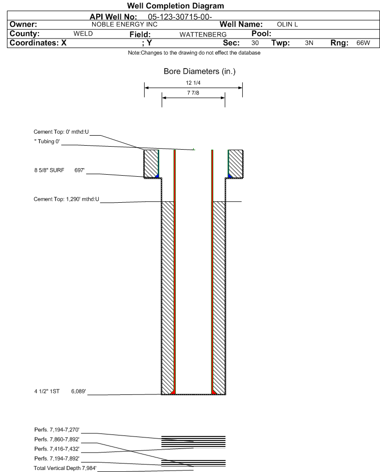 Wellbore #00 Wellbore Classification: GW Status: SI - 6/1/2025 Measured TD: 8093 ft. Vertical TD: 7984 ft.| Wellbore Data for Original Wellbore | Wellbore Classification: GW SI - 6/1/2025 | | Wellbore Permit | DIRECTIONAL | | Permit #: | | Expiration Date: | 10/28/2011 | | Proposed Top PZ Location: | Sec:30 Twp: 3N 66W | Footage: 79 FSL 2572 FEL | | Bottom Hole Location: | Sec:30 Twp: 3N 66W | Footage: 79 FSL 2572 FEL | | Proposed Depth/Form: | 8000 ft. | | Surface Mineral Owner Same: | No | | Mineral Owner: | FEE | Surface Owner: | FEE | | Unit: | | Unit Number: | | | Formation And Spacing: | Code: CODL , Formation: CODELL , Order: 407-87 , Unit Acreage: 160, Drill Unit: GWA | | Formation And Spacing: | Code: JSND , Formation: J SAND , Order: , Unit Acreage: 160, Drill Unit: GWA | | Formation And Spacing: | Code: NBRR , Formation: NIOBRARA , Order: 407-87 , Unit Acreage: 160, Drill Unit: GWA |