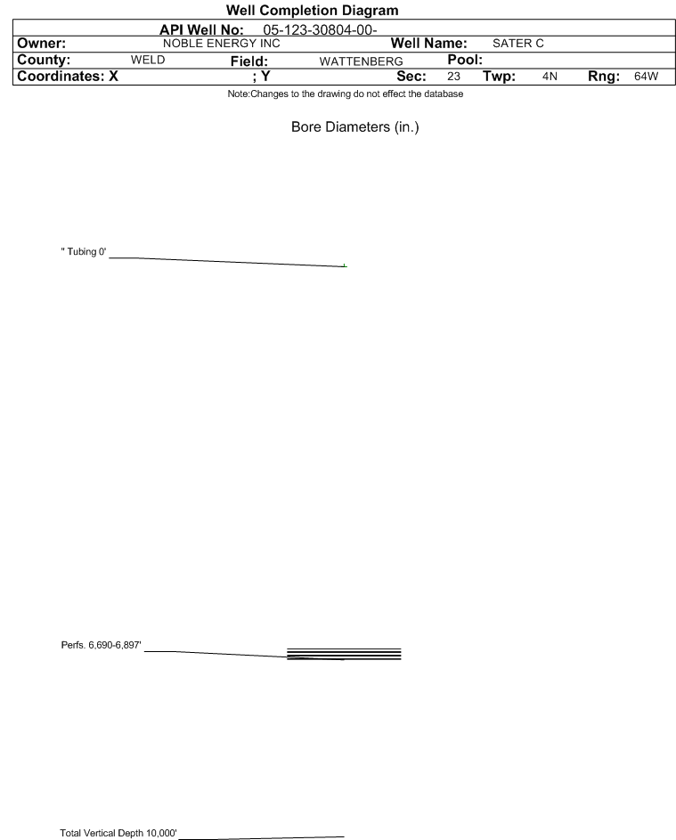 Wellbore #00 Wellbore Classification: OW Status: AB - 4/16/2025 Measured TD: 7070 ft. Vertical TD: 6926 ft.| Wellbore Data for Original Wellbore | Wellbore Classification: OW AB - 4/16/2025 | | Wellbore Permit | DIRECTIONAL | | Permit #: | | Expiration Date: | 11/23/2011 | | Proposed Top PZ Location: | Sec:23 Twp: 4N 64W | Footage: 71 FNL 2600 FEL | | Bottom Hole Location: | Sec:23 Twp: 4N 64W | Footage: 70 FNL 2607 FEL | | Proposed Depth/Form: | 7035 ft. | | Surface Mineral Owner Same: | No | | Mineral Owner: | FEE | Surface Owner: | FEE | | Unit: | | Unit Number: | | | Formation And Spacing: | Code: CODL , Formation: CODELL , Order: 407-87 , Unit Acreage: 160, Drill Unit: GWA | | Formation And Spacing: | Code: NBRR , Formation: NIOBRARA , Order: 407-87 , Unit Acreage: 160, Drill Unit: GWA | | Casing: | String Type: SURF, Hole Size: 12.25 in., Size: 8.625 in., Top: , Depth: 520 ft., Weight: 24 , Citings Type: PLANNED | | Cement: | Sacks: 220, Top: 0 ft., Bottom: 520 ft. | | Casing: | String Type: 1ST, Hole Size: 7.875 in., Size: 4.5 in., Top: , Depth: 7035 ft., Weight: 11.6 , Citings Type: PLANNED | | Cement: | Sacks: 626, Top: , Bottom: 7035 ft. |