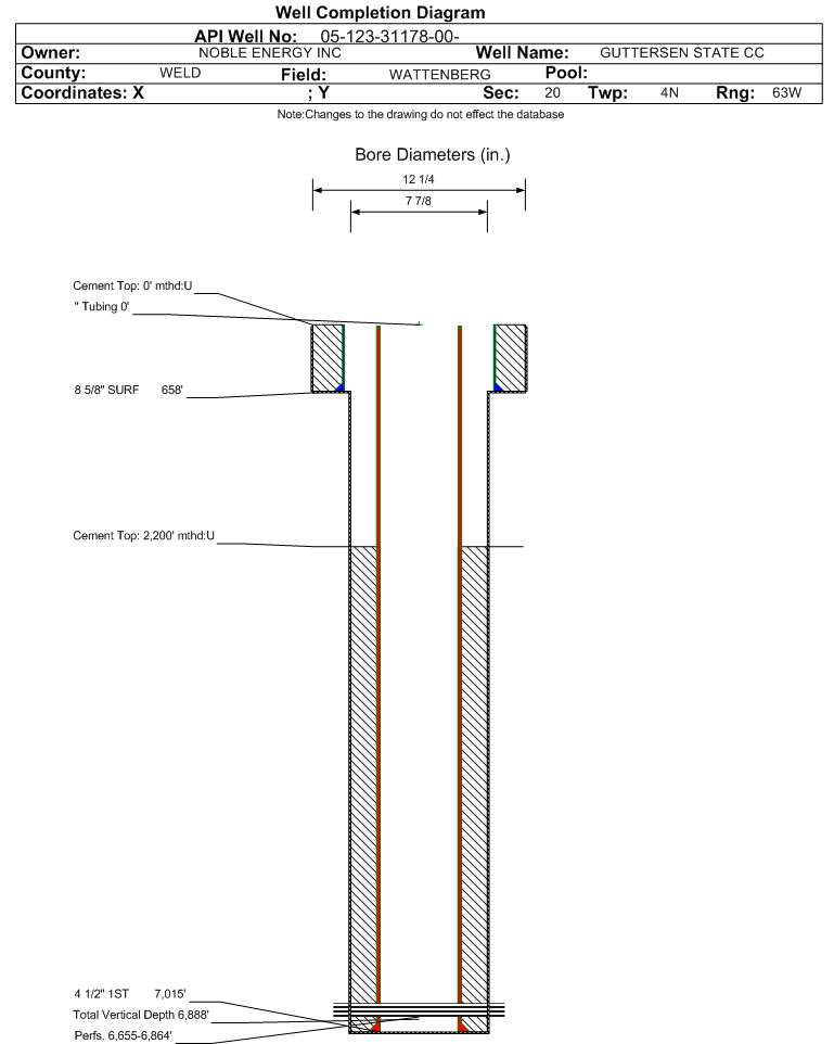 Wellbore #00 Wellbore Classification: OW Status: AB - 5/19/2023 Measured TD: 7021 ft. Vertical TD: 6888 ft.| Wellbore Data for Original Wellbore | Wellbore Classification: OW AB - 5/19/2023 | | Wellbore Permit | DIRECTIONAL | | Permit #: | | Expiration Date: | 2/19/2012 | | Proposed Top PZ Location: | Sec:19 Twp: 4N 63W | Footage: 1222 FSL 61 FEL | | Bottom Hole Location: | Sec:19 Twp: 4N 63W | Footage: 1222 FSL 61 FEL | | Proposed Depth/Form: | 7035 ft. | | Surface Mineral Owner Same: | No | | Mineral Owner: | FEE | Surface Owner: | FEE | | Unit: | | Unit Number: | | | Formation And Spacing: | Code: CODL , Formation: CODELL , Order: 407-87 , Unit Acreage: 160, Drill Unit: GWA | | Formation And Spacing: | Code: NBRR , Formation: NIOBRARA , Order: 407-87 , Unit Acreage: 160, Drill Unit: GWA | | Casing: | String Type: SURF, Hole Size: 12.25 in., Size: 8.625 in., Top: , Depth: 600 ft., Weight: 24 , Citings Type: PLANNED | | Cement: | Sacks: 252, Top: 0 ft., Bottom: 600 ft. | | Casing: | String Type: 1ST, Hole Size: 7.875 in., Size: 4.5 in., Top: , Depth: 7035 ft., Weight: 11.6 , Citings Type: PLANNED | | Cement: | Sacks: 626, Top: , Bottom: 7035 ft. |