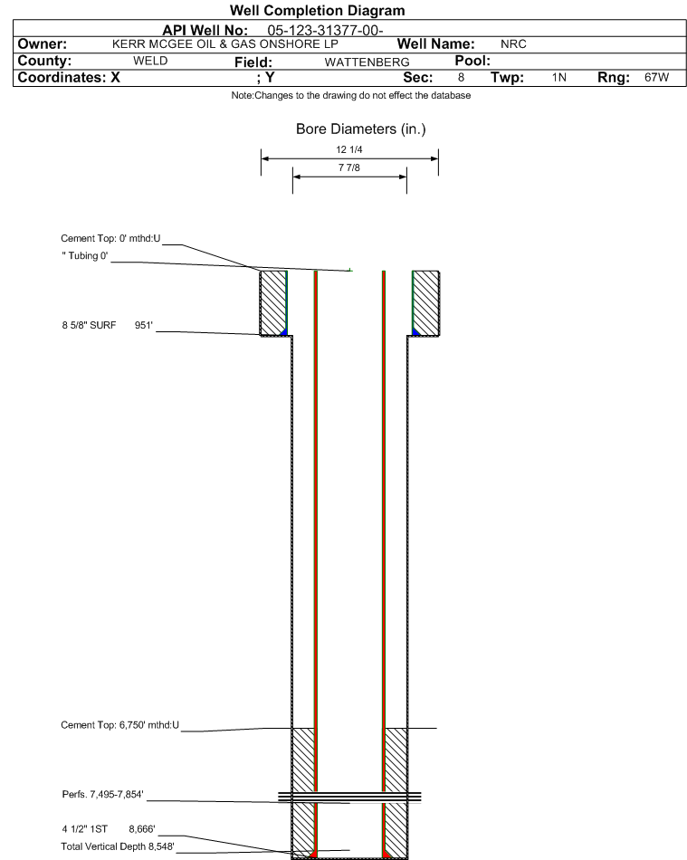Wellbore #00 Wellbore Classification: GW Status: PA - 5/2/2019 Measured TD: 8675 ft. Vertical TD: 8548 ft.| Wellbore Data for Original Wellbore | Wellbore Classification: GW PA - 5/2/2019 | | Wellbore Permit | DIRECTIONAL | | Permit #: | | Expiration Date: | 4/5/2012 | | Proposed Top PZ Location: | Sec:8 Twp: 1N 67W | Footage: 660 FSL 660 FWL | | Bottom Hole Location: | Sec:8 Twp: 1N 67W | Footage: 660 FSL 660 FWL | | Proposed Depth/Form: | 8687 ft. | | Surface Mineral Owner Same: | Yes | | Mineral Owner: | FEE | Surface Owner: | FEE | | Unit: | | Unit Number: | | | Formation And Spacing: | Code: DKTA , Formation: DAKOTA , Order: 499-15 , Unit Acreage: 320, Drill Unit: S/2 | | Formation And Spacing: | Code: JSND , Formation: J SAND , Order: 232 , Unit Acreage: 320, Drill Unit: S/2 | | Formation And Spacing: | Code: NB-CD , Formation: NIOBRARA-CODELL , Order: 407 , Unit Acreage: 80, Drill Unit: S/2SW/4 | | Formation And Spacing: | Code: SUSX , Formation: SUSSEX , Order: 250 , Unit Acreage: 80, Drill Unit: W/2SW/4 | | Casing: | String Type: SURF, Hole Size: 12.25 in., Size: 8.625 in., Top: , Depth: 900 ft., Weight: 24 , Citings Type: PLANNED | | Cement: | Sacks: 630, Top: 0 ft., Bottom: 900 ft. | | Casing: | String Type: 1ST, Hole Size: 7.875 in., Size: 4.5 in., Top: , Depth: 8687 ft., Weight: 11.6 , Citings Type: PLANNED | | Cement: | Sacks: 200, Top: , Bottom: 8687 ft. |