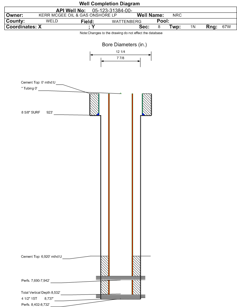 Wellbore #00 Wellbore Classification: OW Status: PA - 5/1/2019 Measured TD: 8750 ft. Vertical TD: 8532 ft.| Wellbore Data for Original Wellbore | Wellbore Classification: OW PA - 5/1/2019 | | Wellbore Permit | DIRECTIONAL | | Permit #: | | Expiration Date: | 4/5/2012 | | Proposed Top PZ Location: | Sec:8 Twp: 1N 67W | Footage: 660 FSL 1980 FWL | | Bottom Hole Location: | Sec:8 Twp: 1N 67W | Footage: 660 FSL 1980 FWL | | Proposed Depth/Form: | 8793 ft. | | Surface Mineral Owner Same: | Yes | | Mineral Owner: | FEE | Surface Owner: | FEE | | Unit: | | Unit Number: | | | Formation And Spacing: | Code: DKTA , Formation: DAKOTA , Order: 499-15 , Unit Acreage: 320, Drill Unit: S/2 | | Formation And Spacing: | Code: JSND , Formation: J SAND , Order: 232 , Unit Acreage: 320, Drill Unit: S/2 | | Formation And Spacing: | Code: NB-CD , Formation: NIOBRARA-CODELL , Order: 407 , Unit Acreage: 80, Drill Unit: S/2SW/4 | | Formation And Spacing: | Code: SUSX , Formation: SUSSEX , Order: 250 , Unit Acreage: 80, Drill Unit: E/2SW/4 | | Casing: | String Type: SURF, Hole Size: 12.25 in., Size: 8.625 in., Top: , Depth: 900 ft., Weight: 24 , Citings Type: PLANNED | | Cement: | Sacks: 630, Top: 0 ft., Bottom: 900 ft. | | Casing: | String Type: 1ST, Hole Size: 7.875 in., Size: 4.5 in., Top: , Depth: 8793 ft., Weight: 11.6 , Citings Type: PLANNED | | Cement: | Sacks: 200, Top: , Bottom: 8793 ft. |