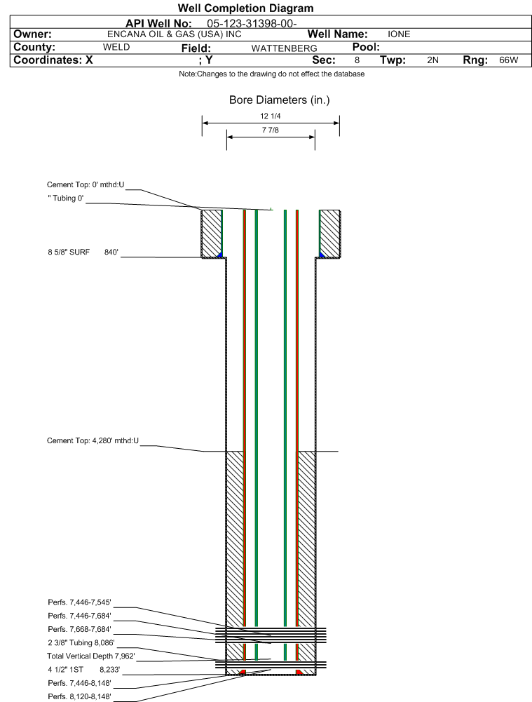 | Wellbore Completed | | Completion Date: | 12/1/2012 | | Spud Date: | 11/27/2012 | Spud Date Is: | ACTUAL | | Measured TD: | 8244 ft. | Measured PB depth: | 8208 ft. | | True Vertical TD: | 7962 ft. | True Vertical PB depth: | 7926 ft. | | Top PZ Location: | Sec:8 Twp: 2N 66W | Footage: 1322 FSL 2647 FEL | | Bottom Hole Location: | Sec:8 Twp: 2N 66W | Footage: 1325 FSL 2654 FEL | | Log Types: | CBL | | Casing: | String Type: SURF, Hole Size: 12.25 in., Size: 8.625 in., Top: 0 ft., Depth: 840 ft., Weight: , Citings Type: ACTUAL | | Cement: | Sacks: 325, Top: 0 ft., Bottom: 852 ft., Determination Method: CALC | | Casing: | String Type: 1ST, Hole Size: 7.875 in., Size: 4.5 in., Top: 0 ft., Depth: 8233 ft., Weight: , Citings Type: ACTUAL | | Cement: | Sacks: 678, Top: 4280 ft., Bottom: 8244 ft., Determination Method: CBL | | Formation | Interval Top | Log Bottom | Cored | DSTs | | SUSSEX | 4746 ft. | | | | | NIOBRARA | 7398 ft. | | | | | CODELL | 7666 ft. | | | | | J SAND | 8108 ft. | | | |