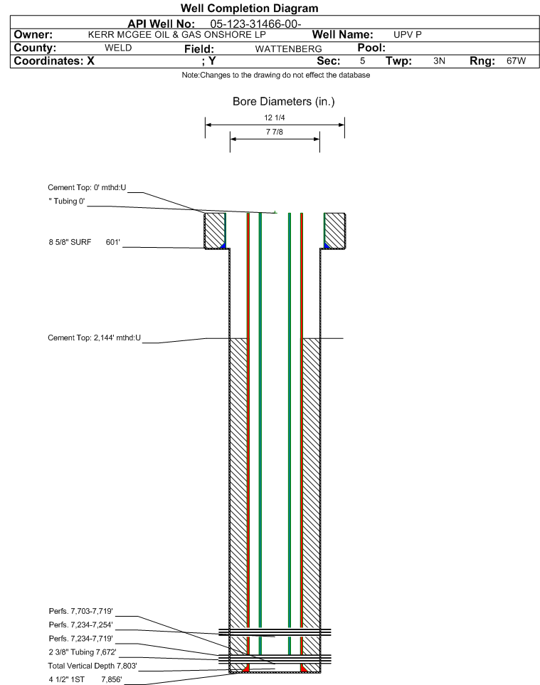 Wellbore #00 Wellbore Classification: OW Status: PA - 7/6/2018 Measured TD: 7823 ft. Vertical TD: 7803 ft.| Wellbore Data for Original Wellbore | Wellbore Classification: OW PA - 7/6/2018 | | Wellbore Permit | DIRECTIONAL | | Permit #: | | Expiration Date: | 4/15/2012 | | Proposed Top PZ Location: | Sec:5 Twp: 3N 67W | Footage: 2632 FNL 2377 FEL | | Bottom Hole Location: | Sec:5 Twp: 3N 67W | Footage: 2632 FNL 2377 FEL | | Proposed Depth/Form: | 7823 ft. | | Surface Mineral Owner Same: | No | | Mineral Owner: | FEE | Surface Owner: | FEE | | Unit: | | Unit Number: | | | Formation And Spacing: | Code: CODL , Formation: CODELL , Order: 407-87 , Unit Acreage: 160, Drill Unit: GWA | | Formation And Spacing: | Code: JSND , Formation: J SAND , Order: 232-23 , Unit Acreage: 160, Drill Unit: GWA | | Formation And Spacing: | Code: NBRR , Formation: NIOBRARA , Order: 407-87 , Unit Acreage: 160, Drill Unit: GWA | | Casing: | String Type: SURF, Hole Size: 12.25 in., Size: 8.625 in., Top: , Depth: 500 ft., Weight: 24 , Citings Type: PLANNED | | Cement: | Sacks: 208, Top: 0 ft., Bottom: 500 ft. | | Casing: | String Type: 1ST, Hole Size: 7.875 in., Size: 4.5 in., Top: , Depth: 7360 ft., Weight: 11.6 , Citings Type: PLANNED | | Cement: | Sacks: 674, Top: , Bottom: 7360 ft. |