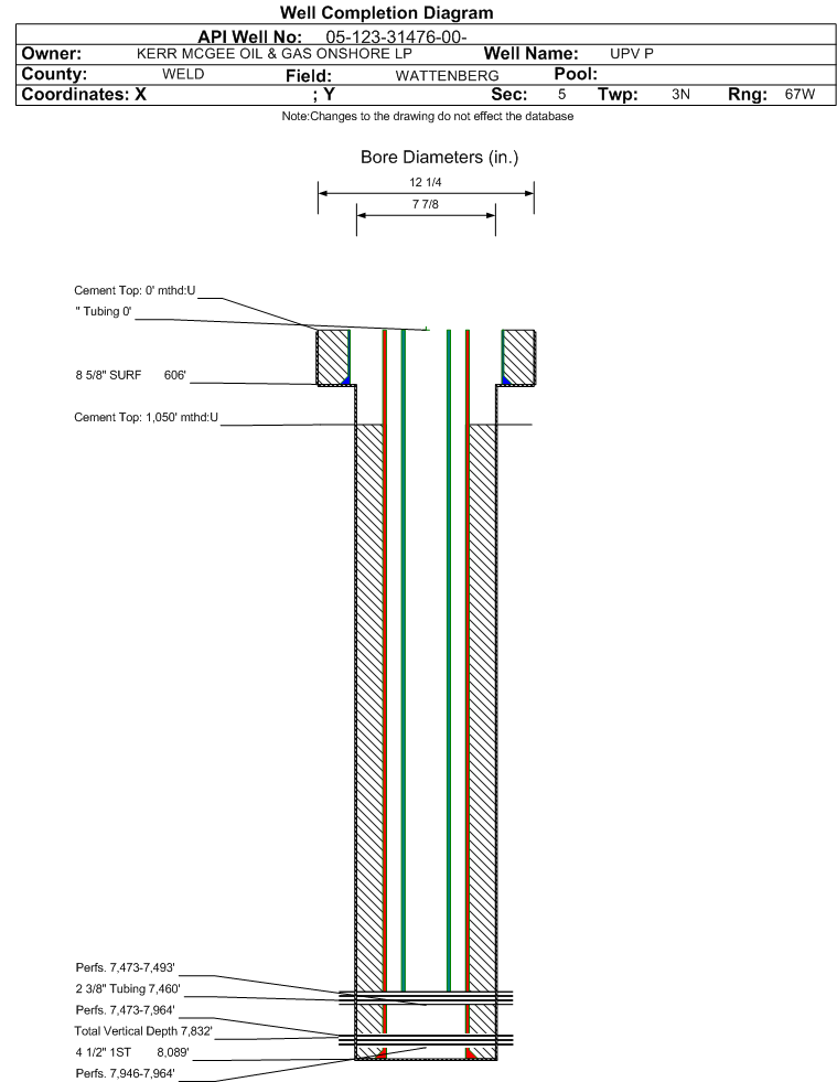 Wellbore #00 Wellbore Classification: OW Status: PA - 8/3/2021 Measured TD: 8095 ft. Vertical TD: 7832 ft.| Wellbore Data for Original Wellbore | Wellbore Classification: OW PA - 8/3/2021 | | Wellbore Permit | DIRECTIONAL | | Permit #: | | Expiration Date: | 4/20/2012 | | Proposed Top PZ Location: | Sec:5 Twp: 3N 67W | Footage: 1353 FNL 2325 FEL | | Bottom Hole Location: | Sec:5 Twp: 3N 67W | Footage: 1357 FNL 2321 FEL | | Proposed Depth/Form: | 8069 ft. | | Surface Mineral Owner Same: | No | | Mineral Owner: | FEE | Surface Owner: | FEE | | Unit: | | Unit Number: | | | Formation And Spacing: | Code: CODL , Formation: CODELL , Order: 407-87 , Unit Acreage: 160, Drill Unit: GWA | | Formation And Spacing: | Code: JSND , Formation: J SAND , Order: 232-23 , Unit Acreage: 160, Drill Unit: GWA | | Formation And Spacing: | Code: NBRR , Formation: NIOBRARA , Order: 407-87 , Unit Acreage: 160, Drill Unit: GWA | | Casing: | String Type: SURF, Hole Size: 12.25 in., Size: 8.625 in., Top: , Depth: 500 ft., Weight: 24 , Citings Type: PLANNED | | Cement: | Sacks: 212, Top: 0 ft., Bottom: 500 ft. | | Casing: | String Type: 1ST, Hole Size: 7.875 in., Size: 4.5 in., Top: , Depth: 7615 ft., Weight: 11.6 , Citings Type: PLANNED | | Cement: | Sacks: 712, Top: , Bottom: 7615 ft. |