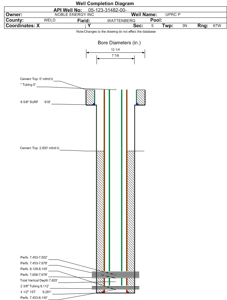 | Wellbore Completed | | Completion Date: | 3/3/2012 | | Spud Date: | 2/18/2012 | Spud Date Is: | ACTUAL | | Measured TD: | 8292 ft. | Measured PB depth: | 8237 ft. | | True Vertical TD: | 7825 ft. | True Vertical PB depth: | 7770 ft. | | Top PZ Location: | Sec:5 Twp: 3N 67W | Footage: 1392 FSL 201 FEL | | Bottom Hole Location: | Sec:5 Twp: 3N 67 | Footage: 1372 FSL 177 FEL | | Log Types: | CBL | | Casing: | String Type: SURF, Hole Size: 12.25 in., Size: 8.625 in., Top: 0 ft., Depth: 614 ft., Weight: 24 , Citings Type: ACTUAL | | Cement: | Sacks: 229, Top: 0 ft., Bottom: 614 ft., Determination Method: VISU | | Casing: | String Type: 1ST, Hole Size: 7.875 in., Size: 4.5 in., Top: 0 ft., Depth: 8277 ft., Weight: 11.6 , Citings Type: ACTUAL | | Cement: | Sacks: 730, Top: 2900 ft., Bottom: 8277 ft., Determination Method: CBL | | Formation | Interval Top | Log Bottom | Cored | DSTs | | PIERRE | 352 ft. | | | | | PARKMAN | 3805 ft. | | | | | SUSSEX | 4428 ft. | | | | | SHANNON | 4908 ft. | | | | | NIOBRARA | 7365 ft. | | | | | FORT HAYS | 7635 ft. | | | | | CODELL | 7655 ft. | | | | | MOWRY | 8083 ft. | | | | | J SAND | 8102 ft. | | | |