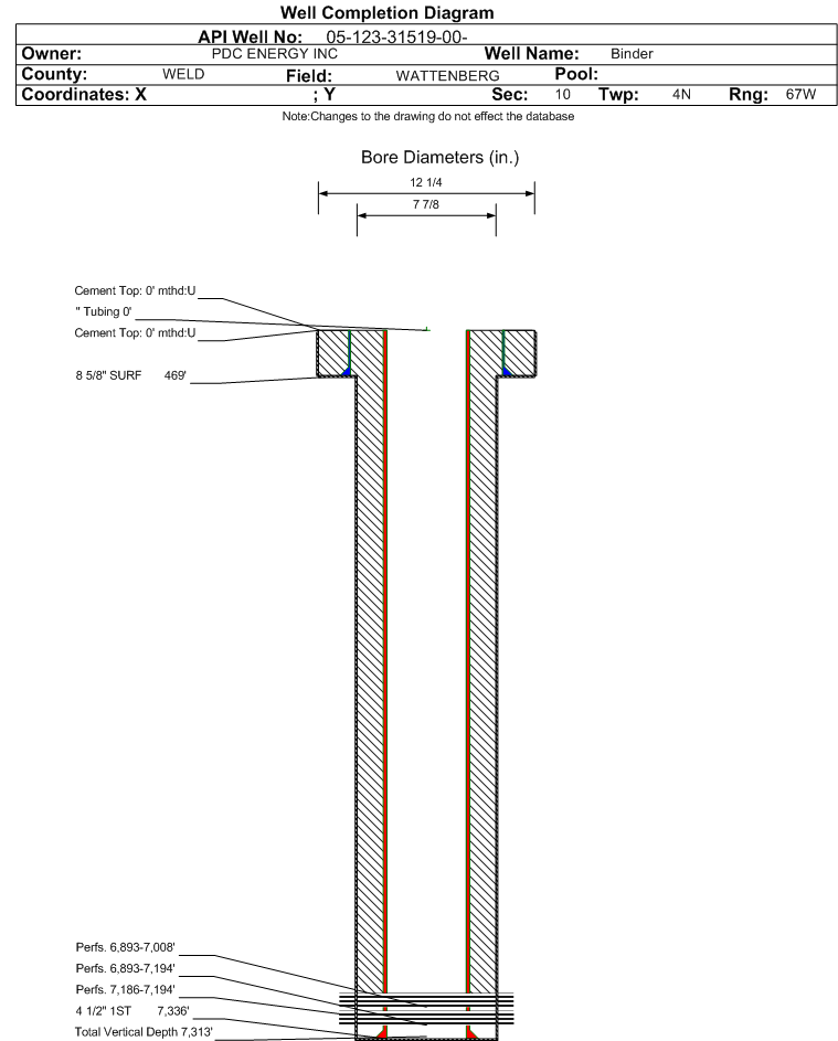 Wellbore #00 Wellbore Classification: OW Status: PA - 7/29/2022 Measured TD: 7360 ft. Vertical TD: 7313 ft.| Wellbore Data for Original Wellbore | Wellbore Classification: OW PA - 7/29/2022 | | Wellbore Permit | DIRECTIONAL | | Permit #: | | Expiration Date: | 4/29/2012 | | Proposed Top PZ Location: | Sec:10 Twp: 4N 67W | Footage: 2162 FNL 753 FWL | | Bottom Hole Location: | Sec:10 Twp: 4N 67W | Footage: 2170 FNL 749 FWL | | Proposed Depth/Form: | 7453 ft. | | Surface Mineral Owner Same: | No | | Mineral Owner: | FEE | Surface Owner: | FEE | | Unit: | | Unit Number: | | | Formation And Spacing: | Code: NB-CD , Formation: NIOBRARA-CODELL , Order: 407-745 , Unit Acreage: 80, Drill Unit: S/2NW4 | | Formation And Spacing: | Code: SX-SN , Formation: SUSSEX-SHANNON , Order: N/A , Unit Acreage: 80, Drill Unit: S/2NW4 | | Casing: | String Type: SURF, Hole Size: 12.25 in., Size: 8.625 in., Top: , Depth: 420 ft., Weight: 24 , Citings Type: PLANNED | | Cement: | Sacks: 250, Top: 0 ft., Bottom: 420 ft. | | Casing: | String Type: S.C. 1.1, Hole Size: 7.875 in., Size: 4.5 in., Top: , Depth: 7453 ft., Weight: 10.5 , Citings Type: PLANNED | | Cement: | Sacks: 200, Top: 5000 ft., Bottom: 7453 ft. |