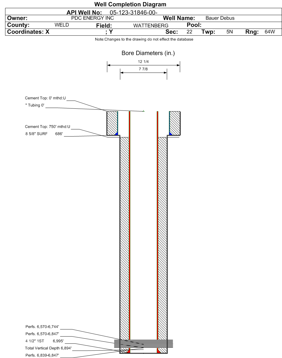 Wellbore #00 Wellbore Classification: OW Status: PA - 7/17/2020 Measured TD: 7005 ft. Vertical TD: 6894 ft.| Wellbore Data for Original Wellbore | Wellbore Classification: OW PA - 7/17/2020 | | Wellbore Permit | DIRECTIONAL | | Permit #: | | Expiration Date: | 7/10/2012 | | Proposed Top PZ Location: | Sec:22 Twp: 5N 64W | Footage: 1366 FNL 1356 FWL | | Bottom Hole Location: | Sec:22 Twp: 5N 64W | Footage: 1367 FNL 1356 FWL | | Proposed Depth/Form: | 7057 ft. | | Surface Mineral Owner Same: | No | | Mineral Owner: | FEE | Surface Owner: | FEE | | Unit: | | Unit Number: | | | Formation And Spacing: | Code: NB-CD , Formation: NIOBRARA-CODELL , Order: 407-87 , Unit Acreage: 160, Drill Unit: NW/4 | | Formation And Spacing: | Code: SX-SN , Formation: SUSSEX-SHANNON , Order: N/A , Unit Acreage: 160, Drill Unit: NW/4 | | Casing: | String Type: SURF, Hole Size: 12.25 in., Size: 8.625 in., Top: , Depth: 650 ft., Weight: 24 , Citings Type: PLANNED | | Cement: | Sacks: 390, Top: 0 ft., Bottom: 650 ft. | | Casing: | String Type: 1ST, Hole Size: 7.875 in., Size: 4.5 in., Top: , Depth: 7057 ft., Weight: 10.5 , Citings Type: PLANNED | | Cement: | Sacks: 120, Top: 5657 ft., Bottom: 7057 ft. |