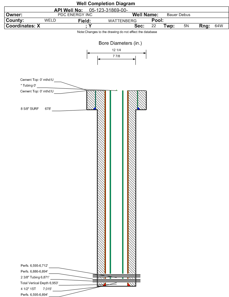 Wellbore #00 Wellbore Classification: OW Status: PA - 4/18/2023 Measured TD: 7045 ft. Vertical TD: 6953 ft.| Wellbore Data for Original Wellbore | Wellbore Classification: OW PA - 4/18/2023 | | Wellbore Permit | DIRECTIONAL | | Permit #: | | Expiration Date: | 7/13/2012 | | Proposed Top PZ Location: | Sec:22 Twp: 5N 64W | Footage: 25 FNL 1334 FWL | | Bottom Hole Location: | Sec:22 Twp: 5N 64W | Footage: 25 FNL 1334 FWL | | Proposed Depth/Form: | 7036 ft. | | Surface Mineral Owner Same: | No | | Mineral Owner: | FEE | Surface Owner: | FEE | | Unit: | | Unit Number: | | | Formation And Spacing: | Code: NB-CD , Formation: NIOBRARA-CODELL , Order: 407-87 , Unit Acreage: 160, Drill Unit: GWA | | Casing: | String Type: SURF, Hole Size: 12.25 in., Size: 8.625 in., Top: , Depth: 650 ft., Weight: 24 , Citings Type: PLANNED | | Cement: | Sacks: 390, Top: 0 ft., Bottom: 650 ft. | | Casing: | String Type: 1ST, Hole Size: 7.875 in., Size: 4.5 in., Top: , Depth: 7036 ft., Weight: 10.5 , Citings Type: PLANNED | | Cement: | Sacks: 117, Top: 5636 ft., Bottom: 7036 ft. |