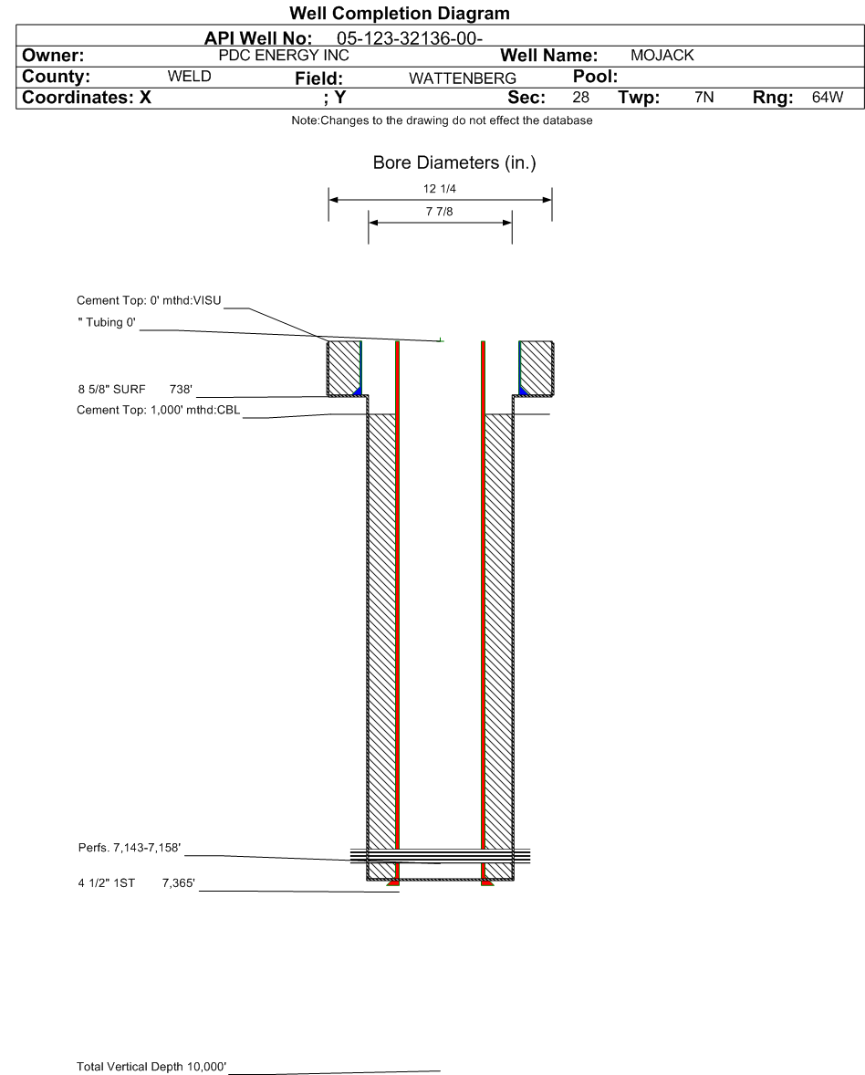 | Wellbore Completed | | Completion Date: | 10/26/2010 | | Spud Date: | 10/21/2010 | Spud Date Is: | ACTUAL | | Measured TD: | 7370 ft. | Measured PB depth: | 7343 ft. | | True Vertical TD: | | True Vertical PB depth: | | | Log Types: | TRIPLE-COMBO, CBL | | Casing: | String Type: SURF, Hole Size: 12.25 in., Size: 8.625 in., Top: 0 ft., Depth: 738 ft., Weight: 24 , Citings Type: ACTUAL | | Cement: | Sacks: 520, Top: 0 ft., Bottom: 738 ft., Determination Method: VISU | | Casing: | String Type: 1ST, Hole Size: 7.875 in., Size: 4.5 in., Top: 0 ft., Depth: 7365 ft., Weight: 11.6 , Citings Type: ACTUAL | | Cement: | Sacks: 710, Top: 1000 ft., Bottom: 7365 ft., Determination Method: CBL | | Formation | Interval Top | Log Bottom | Cored | DSTs | | PARKMAN | 3775 ft. | 3890 ft. | | | | SUSSEX | 4185 ft. | 4285 ft. | | | | SHANNON | 4465 ft. | 4510 ft. | | | | NIOBRARA | 6855 ft. | 7100 ft. | | | | FORT HAYS | 7100 ft. | 7143 ft. | | | | CODELL | 7143 ft. | 7155 ft. | | |