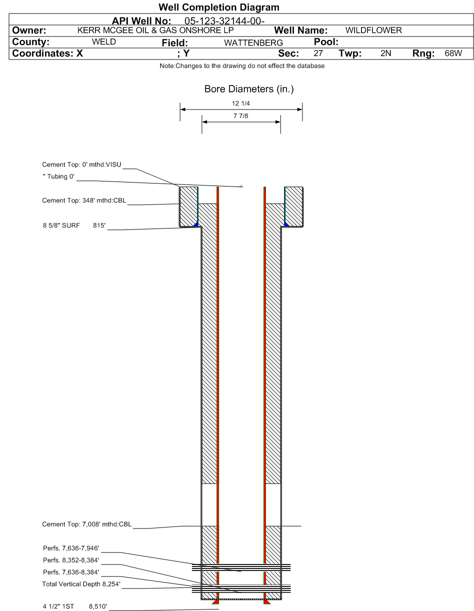 | Wellbore Completed | | Completion Date: | 4/10/2011 | | Spud Date: | 4/6/2011 | Spud Date Is: | ACTUAL | | Measured TD: | 8520 ft. | Measured PB depth: | 8477 ft. | | True Vertical TD: | 8254 ft. | True Vertical PB depth: | 8211 ft. | | Top PZ Location: | Sec:27 Twp: 2N 68W | Footage: 59 FSL 2623 FEL | | Bottom Hole Location: | Sec:27 Twp: 2N 68W | Footage: 56 FSL 2624 FEL | | Log Types: | PRELIMINARY FORM 5 | | Log Types: | SD-DSN-AC-TR; CBL | | Casing: | String Type: SURF, Hole Size: 12.25 in., Size: 8.625 in., Top: 0 ft., Depth: 815 ft., Weight: 24 , Citings Type: ACTUAL | | Cement: | Sacks: 510, Top: 0 ft., Bottom: 815 ft., Determination Method: VISU | | Casing: | String Type: 1ST, Hole Size: 7.875 in., Size: 4.5 in., Top: 0 ft., Depth: 8510 ft., Weight: 11.6 , Citings Type: ACTUAL | | Cement: | Sacks: 220, Top: 7008 ft., Bottom: 8510 ft., Determination Method: CBL | | Casing: | String Type: S.C. 1.1, Hole Size: , Size: , Top: , Depth: 6108 ft., Weight: , Citings Type: ACTUAL | | Cement: | Sacks: 637, Top: 348 ft., Bottom: 6130 ft., Determination Method: CBL | | Formation | Interval Top | Log Bottom | Cored | DSTs | | PARKMAN | 4204 ft. | | | | | SUSSEX | 4653 ft. | 4952 ft. | | | | SHANNON | 5255 ft. | 5280 ft. | | | | NIOBRARA | 7635 ft. | | | | | FORT HAYS | 7905 ft. | | | | | CODELL | 7926 ft. | | | | | J SAND | 8350 ft. | | | |