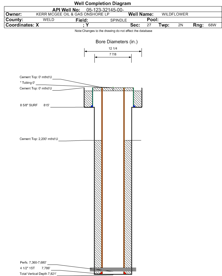 Wellbore #00 Wellbore Classification: OW Status: AB - 8/5/2025 Measured TD: 7840 ft. Vertical TD: 7821 ft.| Wellbore Data for Original Wellbore | Wellbore Classification: OW AB - 8/5/2025 | | Wellbore Permit | DIRECTIONAL | | Permit #: | | Expiration Date: | 8/30/2012 | | Proposed Top PZ Location: | Sec:27 Twp: 2N 68W | Footage: 1320 FSL 1320 FWL | | Bottom Hole Location: | Sec:27 Twp: 2N 68W | Footage: 1320 FSL 1320 FWL | | Proposed Depth/Form: | 8240 ft. | | Surface Mineral Owner Same: | Yes | | Mineral Owner: | FEE | Surface Owner: | FEE | | Unit: | | Unit Number: | | | Formation And Spacing: | Code: NB-CD , Formation: NIOBRARA-CODELL , Order: 407 , Unit Acreage: 160, Drill Unit: SW/4 | | Casing: | String Type: SURF, Hole Size: 12.25 in., Size: 8.625 in., Top: , Depth: 780 ft., Weight: 24 , Citings Type: PLANNED | | Cement: | Sacks: 525, Top: 0 ft., Bottom: 780 ft. | | Casing: | String Type: 1ST, Hole Size: 7.875 in., Size: 4.5 in., Top: , Depth: 8240 ft., Weight: 11.6 , Citings Type: PLANNED | | Cement: | Sacks: 200, Top: , Bottom: 8240 ft. |