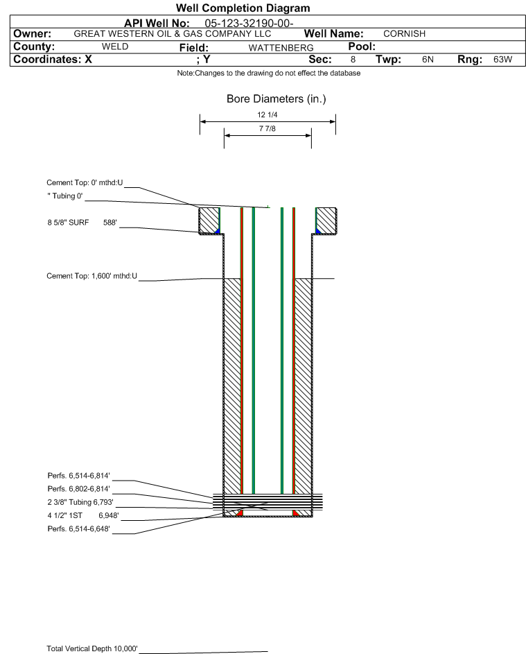 | Wellbore Completed | | Completion Date: | 9/23/2010 | | Spud Date: | 9/20/2010 | Spud Date Is: | ACTUAL | | Measured TD: | 6997 ft. | Measured PB depth: | 6937 ft. | | True Vertical TD: | | True Vertical PB depth: | | | Log Types: | COMPENSATED DENSITY NEUTRON GAMMA RAY, DUAL INDUCTION LOG GAMMA RAY, COMENT BOND-VD | | Casing: | String Type: SURF, Hole Size: 12.25 in., Size: 8.625 in., Top: 0 ft., Depth: 588 ft., Weight: 24 , Citings Type: ACTUAL | | Cement: | Sacks: 370, Top: 0 ft., Bottom: 588 ft., Determination Method: VISU | | Casing: | String Type: 1ST, Hole Size: 7.875 in., Size: 4.5 in., Top: 0 ft., Depth: 6948 ft., Weight: 11.6 , Citings Type: ACTUAL | | Cement: | Sacks: 590, Top: 1436 ft., Bottom: 6948 ft., Determination Method: CBL | | Formation | Interval Top | Log Bottom | Cored | DSTs | | GREELEY SAND | 2790 ft. | | | | | PARKMAN | 3564 ft. | | | | | SUSSEX | 4328 ft. | | | | | SHANNON | 4894 ft. | | | | | NIOBRARA | 6514 ft. | | | | | FORT HAYS | 6764 ft. | | | | | CODELL | 6803 ft. | | | |