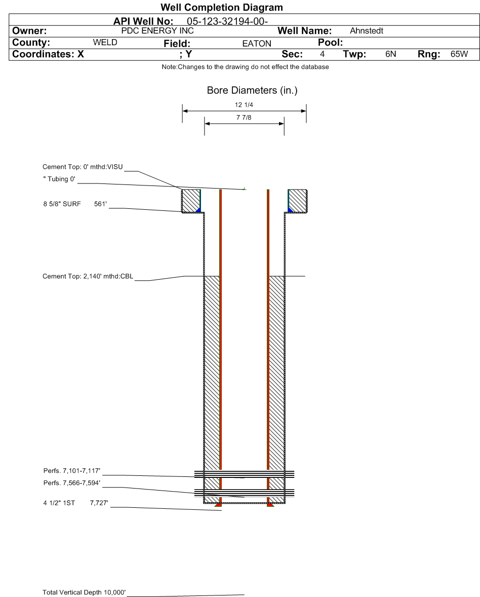 Wellbore #00 Wellbore Classification: OW Status: SI - 4/1/2020 Measured TD: 7737 ft.| Wellbore Data for Original Wellbore | Wellbore Classification: OW SI - 4/1/2020 | | Wellbore Permit | | | Permit #: | | Expiration Date: | 9/7/2012 | | Proposed Depth/Form: | 7743 ft. | | Surface Mineral Owner Same: | Yes | | Mineral Owner: | FEE | Surface Owner: | FEE | | Unit: | | Unit Number: | | | Formation And Spacing: | Code: JNBCD , Formation: J-NIOBRARA-CODELL , Order: 407 , Unit Acreage: 80, Drill Unit: S/2SE4 | | Casing: | String Type: SURF, Hole Size: 12.25 in., Size: 8.625 in., Top: , Depth: 540 ft., Weight: 24 pds , Citings Type: PLANNED | | Cement: | Sacks: 243, Top: 0 ft., Bottom: 540 ft. | | Casing: | String Type: 1ST, Hole Size: 7.875 in., Size: 4.5 in., Top: , Depth: 7743 ft., Weight: 11.6 pds , Citings Type: PLANNED | | Cement: | Sacks: 520, Top: 6588 ft., Bottom: 7743 ft. |