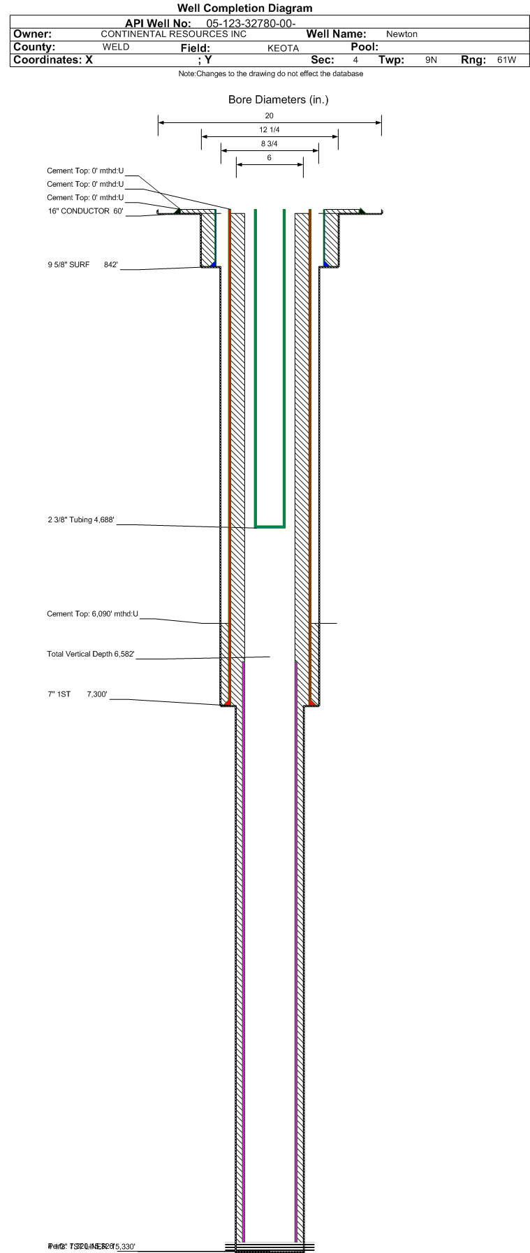 Wellbore #00 Wellbore Classification: OW Status: SI - 8/1/2024 Measured TD: 15360 ft. Vertical TD: 6582 ft.| Wellbore Data for Original Wellbore | Wellbore Classification: OW SI - 8/1/2024 | | Wellbore Permit | HORIZONTAL | | Permit #: | | Expiration Date: | 12/28/2012 | | Proposed Top PZ Location: | Sec:4 Twp: 9N 61W | Footage: 600 FNL 700 FEL | | Bottom Hole Location: | Sec:9 Twp: 9N 61W | Footage: 652 FSL 702 FEL | | Proposed Depth/Form: | 15522 ft. | | Surface Mineral Owner Same: | No | | Mineral Owner: | FEE | Surface Owner: | FEE | | Unit: | | Unit Number: | | | Formation And Spacing: | Code: NBRR , Formation: NIOBRARA , Order: 10-11 , Unit Acreage: 1280, Drill Unit: Sec 4 & 9 | | Casing: | String Type: CONDUCTOR, Hole Size: 26 in., Size: , Top: 0 ft., Depth: 80 ft., Weight: , Citings Type: PLANNED | | Cement: | Sacks: , Top: 0 ft., Bottom: 80 ft. | | Casing: | String Type: SURF, Hole Size: 12.25 in., Size: 9.625 in., Top: 0 ft., Depth: 805 ft., Weight: 36 , Citings Type: PLANNED | | Cement: | Sacks: 360, Top: 0 ft., Bottom: 805 ft. | | Casing: | String Type: 1ST, Hole Size: 8.75 in., Size: 7 in., Top: 0 ft., Depth: 6862 ft., Weight: 26 , Citings Type: PLANNED | | Cement: | Sacks: 956, Top: 0 ft., Bottom: 6862 ft. | | Casing: | String Type: 1ST LINER, Hole Size: 6.125 in., Size: 4.5 in., Top: 6062 ft., Depth: 15522 ft., Weight: 11.6 , Citings Type: PLANNED | | Cement: | Sacks: , Top: , Bottom: |