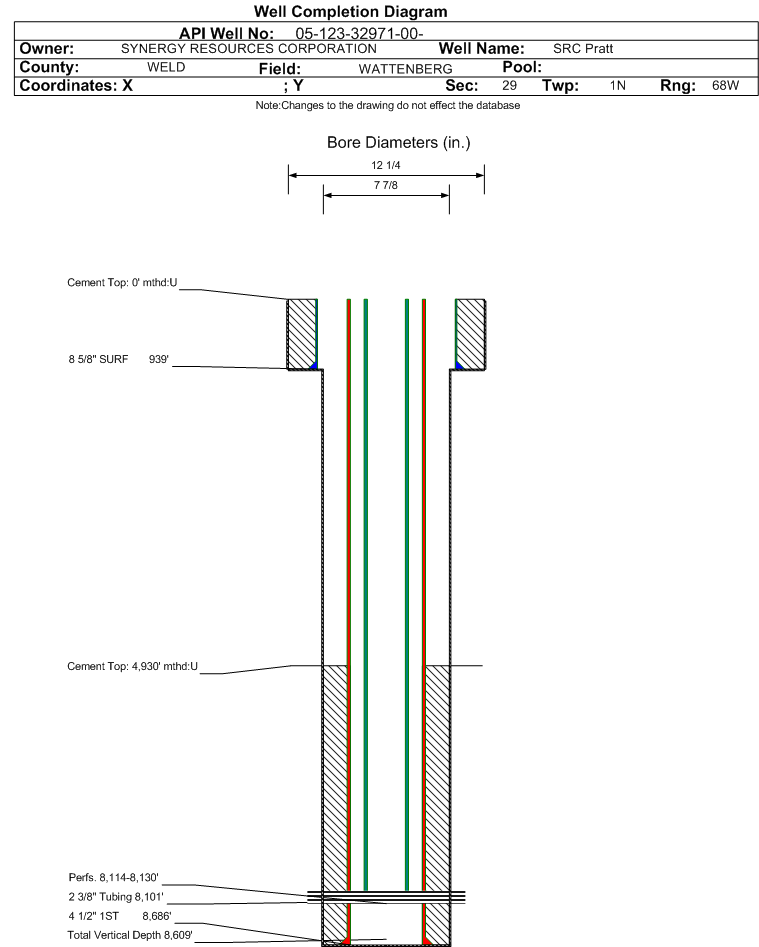 Wellbore #00 Wellbore Classification: OW Status: PR - 3/1/2022 Measured TD: 8717 ft. Vertical TD: 8609 ft.| Wellbore Data for Original Wellbore | Wellbore Classification: OW PR - 3/1/2022 | | Wellbore Permit | DIRECTIONAL | | Permit #: | | Expiration Date: | 2/15/2013 | | Proposed Top PZ Location: | Sec:29 Twp: 1N 68W | Footage: 670 FSL 1939 FWL | | Bottom Hole Location: | Sec:29 Twp: 1N 68W | Footage: 670 FSL 1939 FWL | | Proposed Depth/Form: | 8160 ft. | | Surface Mineral Owner Same: | Yes | | Mineral Owner: | FEE | Surface Owner: | FEE | | Unit: | | Unit Number: | | | Formation And Spacing: | Code: NB-CD , Formation: NIOBRARA-CODELL , Order: 407-87 , Unit Acreage: 80, Drill Unit: E/2SW/4 | | Casing: | String Type: SURF, Hole Size: 12.25 in., Size: 8.625 in., Top: 0 ft., Depth: 900 ft., Weight: 24 , Citings Type: PLANNED | | Cement: | Sacks: 430, Top: 0 ft., Bottom: 900 ft. | | Casing: | String Type: 1ST, Hole Size: 7.875 in., Size: 4.5 in., Top: 0 ft., Depth: 8160 ft., Weight: 11.6 , Citings Type: PLANNED | | Cement: | Sacks: 550, Top: 200 ft., Bottom: 8160 ft. |