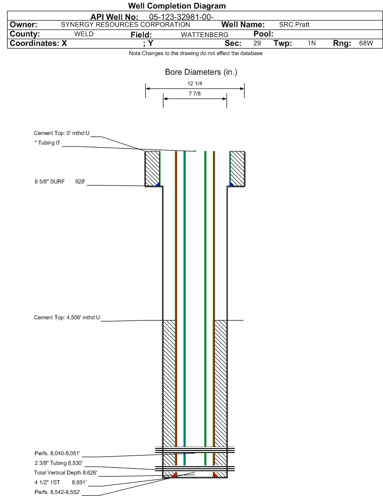 Wellbore #00 Wellbore Classification: OW Status: PR - 7/1/2025 Measured TD: 8744 ft. Vertical TD: 8626 ft.| Wellbore Data for Original Wellbore | Wellbore Classification: OW PR - 7/1/2025 | | Wellbore Permit | DIRECTIONAL | | Permit #: | | Expiration Date: | 2/16/2013 | | Proposed Top PZ Location: | Sec:29 Twp: 1N 68W | Footage: 2003 FSL 680 FWL | | Bottom Hole Location: | Sec:29 Twp: 1N 68W | Footage: 2003 FSL 680 FWL | | Proposed Depth/Form: | 8160 ft. | | Surface Mineral Owner Same: | Yes | | Mineral Owner: | FEE | Surface Owner: | FEE | | Unit: | | Unit Number: | | | Formation And Spacing: | Code: JSND , Formation: J SAND , Order: 232-23 , Unit Acreage: 320, Drill Unit: W/2 | | Formation And Spacing: | Code: NB-CD , Formation: NIOBRARA-CODELL , Order: 407-87 , Unit Acreage: 80, Drill Unit: W/2SW/4 | | Casing: | String Type: SURF, Hole Size: 12.25 in., Size: 8.625 in., Top: 0 ft., Depth: 900 ft., Weight: 24 , Citings Type: PLANNED | | Cement: | Sacks: 430, Top: 0 ft., Bottom: 900 ft. | | Casing: | String Type: 1ST, Hole Size: 7.875 in., Size: 4.5 in., Top: 0 ft., Depth: 8160 ft., Weight: 11.6 , Citings Type: PLANNED | | Cement: | Sacks: 550, Top: 0 ft., Bottom: 8160 ft. |