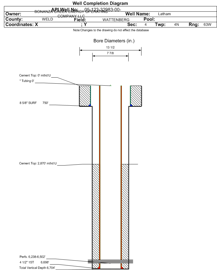 Wellbore #00 Wellbore Classification: GW Status: PA - 7/13/2018 Measured TD: 6705 ft. Vertical TD: 6704 ft.| Wellbore Data for Original Wellbore | Wellbore Classification: GW PA - 7/13/2018 | | Wellbore Permit | DRIFTED | | Permit #: | | Expiration Date: | 2/16/2013 | | Proposed Top PZ Location: | Sec:4 Twp: 4N 63W | Footage: 515 FNL 463 FEL | | Bottom Hole Location: | Sec:4 Twp: 4N 63W | Footage: 515 FNL 463 FEL | | Proposed Depth/Form: | 6750 ft. | | Surface Mineral Owner Same: | No | | Mineral Owner: | FEE | Surface Owner: | FEE | | Unit: | | Unit Number: | | | Formation And Spacing: | Code: NB-CD , Formation: NIOBRARA-CODELL , Order: , Unit Acreage: 40, Drill Unit: NE/4 NE/4 | | Casing: | String Type: SURF, Hole Size: 12.25 in., Size: 8.625 in., Top: 0 ft., Depth: 697 ft., Weight: 24 , Citings Type: PLANNED | | Cement: | Sacks: 290, Top: 0 ft., Bottom: 697 ft. | | Casing: | String Type: 1ST, Hole Size: 7.875 in., Size: 4.5 in., Top: 0 ft., Depth: 6750 ft., Weight: 11.6 , Citings Type: PLANNED | | Cement: | Sacks: 200, Top: 6000 ft., Bottom: 6750 ft. |