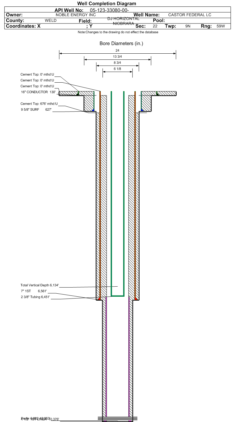 | Wellbore Completed | | Completion Date: | 1/18/2013 | | Spud Date: | 1/11/2013 | Spud Date Is: | ACTUAL | | Measured TD: | 10435 ft. | Measured PB depth: | 10435 ft. | | True Vertical TD: | 6134 ft. | True Vertical PB depth: | 6134 ft. | | Top PZ Location: | Sec:22 Twp: 9N 59W | Footage: 1203 FNL 456 FWL | | Bottom Hole Location: | Sec:22 Twp: 9N 59W | Footage: 704 FSL 672 FWL | | Log Types: | CBL/Mud/Gamma. | | Casing: | String Type: CONDUCTOR, Hole Size: 24 in., Size: 16 in., Top: 0 ft., Depth: 130 ft., Weight: 42.09 , Citings Type: ACTUAL | | Cement: | Sacks: 160, Top: 0 ft., Bottom: 130 ft., Determination Method: VISU | | Casing: | String Type: SURF, Hole Size: 13.75 in., Size: 9.625 in., Top: 0 ft., Depth: 627 ft., Weight: 36 , Citings Type: ACTUAL | | Cement: | Sacks: 326, Top: 0 ft., Bottom: 627 ft., Determination Method: VISU | | Casing: | String Type: 1ST, Hole Size: 8.75 in., Size: 7 in., Top: 0 ft., Depth: 6561 ft., Weight: 26 , Citings Type: ACTUAL | | Cement: | Sacks: 540, Top: 676 ft., Bottom: 6561 ft., Determination Method: CBL | | Casing: | String Type: 1ST LINER, Hole Size: 6.125 in., Size: 4.5 in., Top: 6454 ft., Depth: 10376 ft., Weight: 11.6 , Citings Type: ACTUAL | | Cement: | Sacks: , Top: , Bottom: , Determination Method: | | Formation | Interval Top | Log Bottom | Cored | DSTs | | PIERRE | 2556 ft. | | | | | PARKMAN | 3470 ft. | | | | | SUSSEX | 4200 ft. | | | | | SHANNON | 4626 ft. | | | | | NIOBRARA | 6183 ft. | | | |