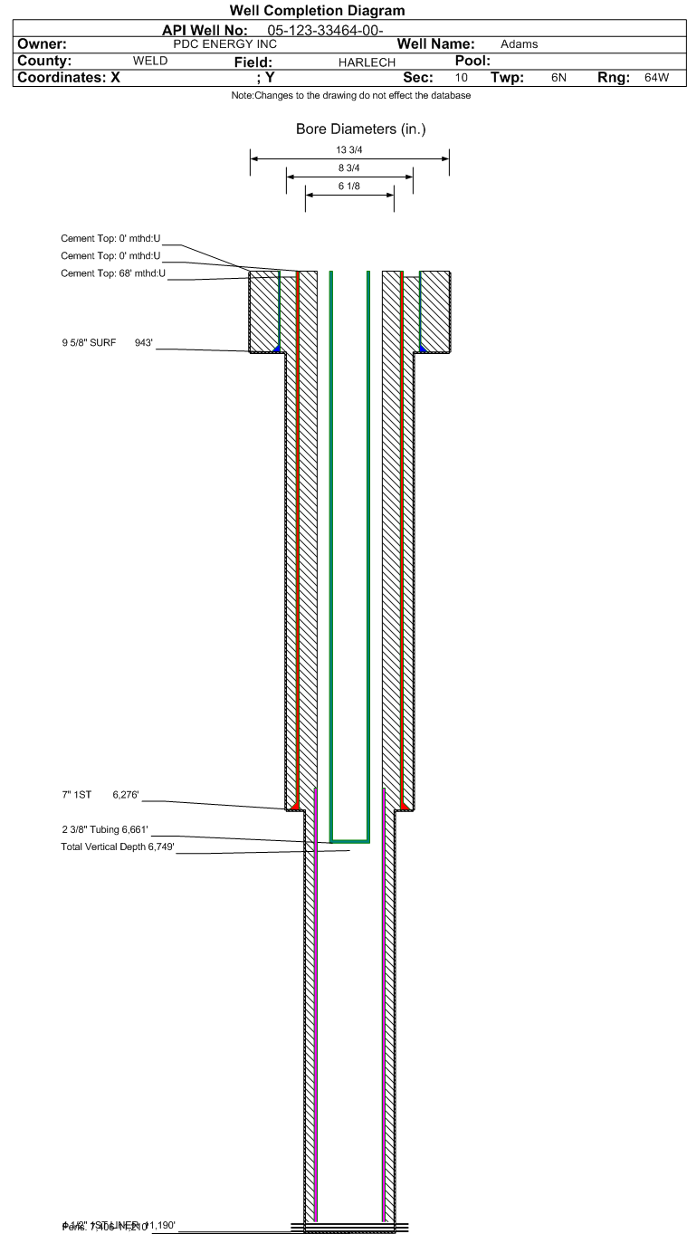 Wellbore #00 Wellbore Classification: OW Status: AB - 8/6/2025 Measured TD: 11210 ft. Vertical TD: 6749 ft.| Wellbore Data for Original Wellbore | Wellbore Classification: OW AB - 8/6/2025 | | Wellbore Permit | HORIZONTAL | | Permit #: | | Expiration Date: | 4/28/2013 | | Proposed Top PZ Location: | Sec:10 Twp: 6N 64W | Footage: 1014 FNL 1274 FEL | | Bottom Hole Location: | Sec:10 Twp: 6N 64W | Footage: 501 FSL 1235 FEL | | Proposed Depth/Form: | 11023 ft. | | Surface Mineral Owner Same: | Yes | | Mineral Owner: | FEE | Surface Owner: | FEE | | Unit: | | Unit Number: | | | Formation And Spacing: | Code: NBRR , Formation: NIOBRARA , Order: 407-87 , Unit Acreage: 320, Drill Unit: E/2 | | Casing: | String Type: SURF, Hole Size: 12.25 in., Size: 9.625 in., Top: 0 ft., Depth: 750 ft., Weight: 36 , Citings Type: PLANNED | | Cement: | Sacks: 159, Top: 0 ft., Bottom: 750 ft. | | Casing: | String Type: 1ST, Hole Size: 8.75 in., Size: 7 in., Top: 0 ft., Depth: 7229 ft., Weight: 26 , Citings Type: PLANNED | | Cement: | Sacks: 809, Top: 600 ft., Bottom: 7229 ft. | | Casing: | String Type: 1ST LINER, Hole Size: 6.125 in., Size: 4.5 in., Top: 6022 ft., Depth: 11023 ft., Weight: 11.6 , Citings Type: PLANNED | | Cement: | Sacks: , Top: , Bottom: |