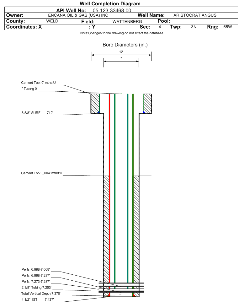 Wellbore #00 Wellbore Classification: GW Status: PA - 2/2/2023 Measured TD: 7450 ft. Vertical TD: 7370 ft.| Wellbore Data for Original Wellbore | Wellbore Classification: GW PA - 2/2/2023 | | Wellbore Permit | DIRECTIONAL | | Permit #: | | Expiration Date: | 4/28/2013 | | Proposed Top PZ Location: | Sec:4 Twp: 3N 65W | Footage: 1313 FNL 1305 FEL | | Bottom Hole Location: | Sec:4 Twp: 3N 65W | Footage: 1314 FNL 1304 FEL | | Proposed Depth/Form: | 7364 ft. | | Surface Mineral Owner Same: | No | | Mineral Owner: | FEE | Surface Owner: | FEE | | Unit: | | Unit Number: | | | Formation And Spacing: | Code: CODL , Formation: CODELL , Order: 407-87 , Unit Acreage: 160, Drill Unit: NE/4 | | Formation And Spacing: | Code: NBRR , Formation: NIOBRARA , Order: 407-87 , Unit Acreage: 160, Drill Unit: NE/4 | | Casing: | String Type: SURF, Hole Size: 12.25 in., Size: 8.625 in., Top: 0 ft., Depth: 600 ft., Weight: 24 , Citings Type: PLANNED | | Cement: | Sacks: 219, Top: , Bottom: 600 ft. | | Casing: | String Type: 1ST, Hole Size: 7.875 in., Size: 4.5 in., Top: 0 ft., Depth: 7364 ft., Weight: 11.6 , Citings Type: PLANNED | | Cement: | Sacks: 102, Top: 6734 ft., Bottom: 7364 ft. | | Casing: | String Type: STAGE TOOL, Hole Size: , Size: , Top: , Depth: 4808 ft., Weight: , Citings Type: PLANNED | | Cement: | Sacks: 83, Top: 4208 ft., Bottom: 4808 ft. |