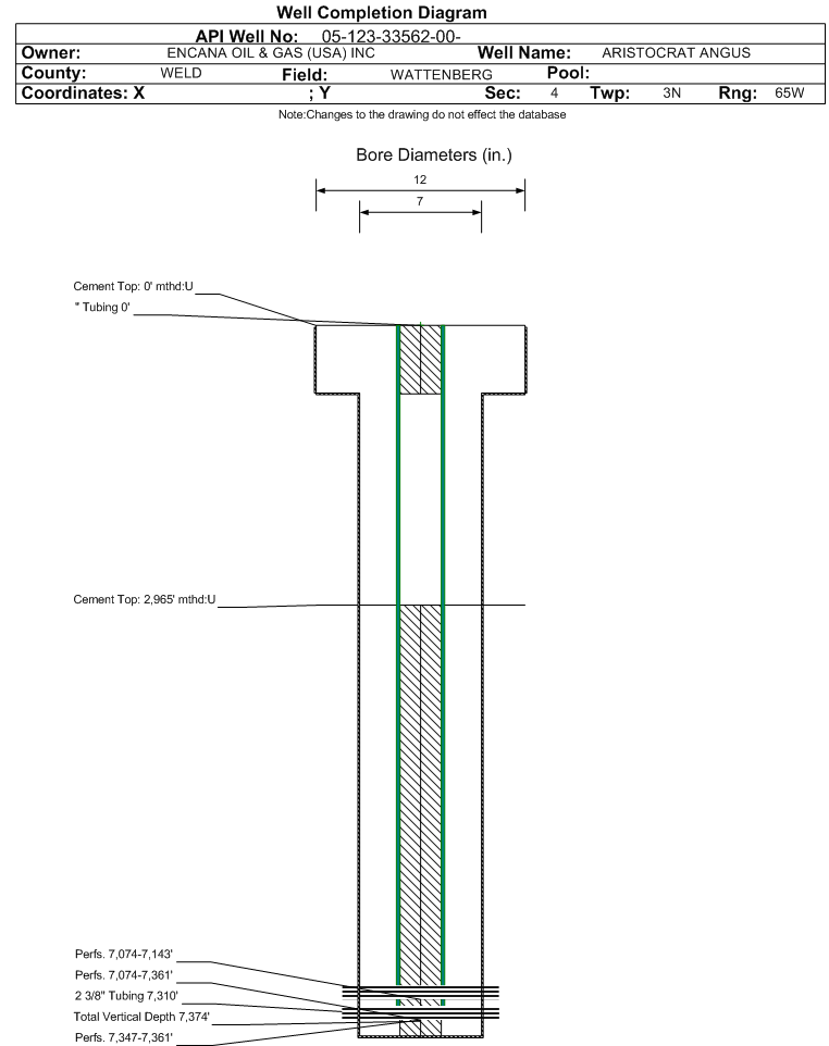 Wellbore #00 Wellbore Classification: GW Status: PA - 6/30/2023 Measured TD: 7540 ft. Vertical TD: 7374 ft.| Wellbore Data for Original Wellbore | Wellbore Classification: GW PA - 6/30/2023 | | Wellbore Permit | DIRECTIONAL | | Permit #: | | Expiration Date: | 5/23/2013 | | Proposed Top PZ Location: | Sec:4 Twp: 3N 65W | Footage: 1304 FNL 55 FEL | | Bottom Hole Location: | Sec:4 Twp: 3N 65W | Footage: 1308 FNL 48 FEL | | Proposed Depth/Form: | 7443 ft. | | Surface Mineral Owner Same: | No | | Mineral Owner: | FEE | Surface Owner: | FEE | | Unit: | | Unit Number: | | | Formation And Spacing: | Code: CODL , Formation: CODELL , Order: 407-87 , Unit Acreage: 160, Drill Unit: GWA | | Formation And Spacing: | Code: NBRR , Formation: NIOBRARA , Order: 407-87 , Unit Acreage: 160, Drill Unit: GWA | | Casing: | String Type: SURF, Hole Size: 12.25 in., Size: 8.625 in., Top: 0 ft., Depth: 600 ft., Weight: 24 , Citings Type: PLANNED | | Cement: | Sacks: 219, Top: 0 ft., Bottom: 600 ft. | | Casing: | String Type: 1ST, Hole Size: 7.875 in., Size: 4.5 in., Top: 0 ft., Depth: 7443 ft., Weight: 11.6 , Citings Type: PLANNED | | Cement: | Sacks: 101, Top: 6815 ft., Bottom: 7443 ft. | | Casing: | String Type: STAGE TOOL, Hole Size: , Size: , Top: , Depth: 4881 ft., Weight: , Citings Type: PLANNED | | Cement: | Sacks: 83, Top: 4281 ft., Bottom: 4881 ft. |