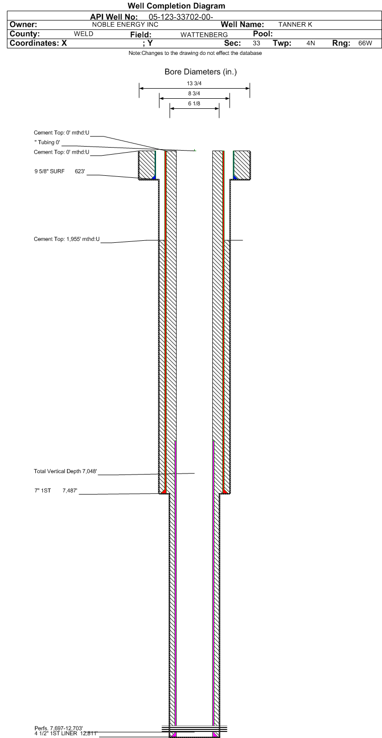 Wellbore #00 Wellbore Classification: OW Status: PR - 12/8/2025 Measured TD: 12826 ft. Vertical TD: 7048 ft.| Wellbore Data for Original Wellbore | Wellbore Classification: OW PR - 12/8/2025 | | Wellbore Permit | HORIZONTAL | | Permit #: | | Expiration Date: | 6/23/2013 | | Proposed Top PZ Location: | Sec:33 Twp: 4N 66W | Footage: 2697 FSL 307 FWL | | Bottom Hole Location: | Sec:34 Twp: 4N 66W | Footage: 2390 FNL 594 FWL | | Proposed Depth/Form: | 12604 ft. | | Surface Mineral Owner Same: | No | | Mineral Owner: | FEE | Surface Owner: | FEE | | Unit: | | Unit Number: | | | Formation And Spacing: | Code: NBRR , Formation: NIOBRARA , Order: 407-87 , Unit Acreage: 400, Drill Unit: GWA | | Casing: | String Type: CONDUCTOR, Hole Size: 18.5 in., Size: 16 in., Top: 0 ft., Depth: 100 ft., Weight: , Citings Type: PLANNED | | Cement: | Sacks: 6, Top: 0 ft., Bottom: 100 ft. | | Casing: | String Type: SURF, Hole Size: 13.75 in., Size: 9.625 in., Top: 0 ft., Depth: 520 ft., Weight: 36 , Citings Type: PLANNED | | Cement: | Sacks: 280, Top: 0 ft., Bottom: 520 ft. | | Casing: | String Type: 1ST, Hole Size: 8.75 in., Size: 7 in., Top: 0 ft., Depth: 7419 ft., Weight: 26 , Citings Type: PLANNED | | Cement: | Sacks: 1115, Top: , Bottom: 7419 ft. | | Casing: | String Type: 2ND, Hole Size: 6.125 in., Size: 4.5 in., Top: 12604 ft., Depth: , Weight: 11.6 , Citings Type: PLANNED | | Cement: | Sacks: , Top: , Bottom: |