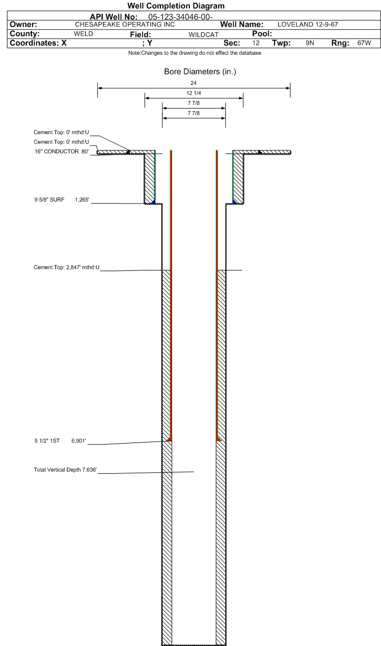 Wellbore #00 Wellbore Classification: OW Status: PA - 9/22/2014 Measured TD: 11755 ft. Vertical TD: 7636 ft.| Wellbore Data for Original Wellbore | Wellbore Classification: OW PA - 9/22/2014 | | Wellbore Permit | HORIZONTAL | | Permit #: | | Expiration Date: | 7/26/2013 | | Proposed Top PZ Location: | Sec:12 Twp: 9N 67W | Footage: 850 FSL 1981 FWL | | Bottom Hole Location: | Sec:12 Twp: 9N 67W | Footage: 513 FNL 1861 FWL | | Proposed Depth/Form: | 11872 ft. | | Surface Mineral Owner Same: | Yes | | Mineral Owner: | FEE | Surface Owner: | FEE | | Unit: | | Unit Number: | | | Formation And Spacing: | Code: NBRR , Formation: NIOBRARA , Order: 535-2 , Unit Acreage: 640, Drill Unit: ALL | | Casing: | String Type: SURF, Hole Size: 12.25 in., Size: 9.625 in., Top: 0 ft., Depth: 1200 ft., Weight: 40 , Citings Type: PLANNED | | Cement: | Sacks: 381, Top: 0 ft., Bottom: 1200 ft. | | Casing: | String Type: 1ST, Hole Size: 8.75 in., Size: 4.5 in., Top: 0 ft., Depth: 11872 ft., Weight: 11.6 , Citings Type: PLANNED | | Cement: | Sacks: 1995, Top: , Bottom: 11872 ft. |