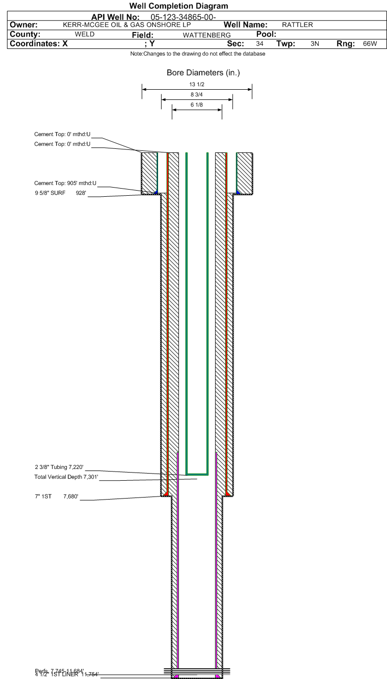 | Wellbore Completed | | Completion Date: | 6/17/2012 | | Spud Date: | 3/24/2012 | Spud Date Is: | ACTUAL | | Measured TD: | 11764 ft. | Measured PB depth: | 11753 ft. | | True Vertical TD: | 7301 ft. | True Vertical PB depth: | 7290 ft. | | Top PZ Location: | Sec:34 Twp: 3N 66W | Footage: 705 FSL 560 FWL | | Bottom Hole Location: | Sec:34 Twp: 3N 66W | Footage: 488 FNL 495 FWL | | Log Types: | PRELIMINARY FORM 5 | | Log Types: | CS-NGR; LPLOT VH; CBL | | Casing: | String Type: SURF, Hole Size: 13.5 in., Size: 9.625 in., Top: 0 ft., Depth: 928 ft., Weight: 36 , Citings Type: ACTUAL | | Cement: | Sacks: 680, Top: 0 ft., Bottom: 928 ft., Determination Method: CALC | | Casing: | String Type: 1ST, Hole Size: 8.75 in., Size: 7 in., Top: 0 ft., Depth: 7680 ft., Weight: 26 , Citings Type: ACTUAL | | Cement: | Sacks: 744, Top: 905 ft., Bottom: 7680 ft., Determination Method: CBL | | Casing: | String Type: 1ST LINER, Hole Size: 6.125 in., Size: 4.5 in., Top: 6702 ft., Depth: 11754 ft., Weight: 11.6 , Citings Type: ACTUAL | | Cement: | Sacks: , Top: , Bottom: , Determination Method: CALC | | Formation | Interval Top | Log Bottom | Cored | DSTs | | SHARON SPRINGS | 7160 ft. | | | | | NIOBRARA | 7271 ft. | | | |