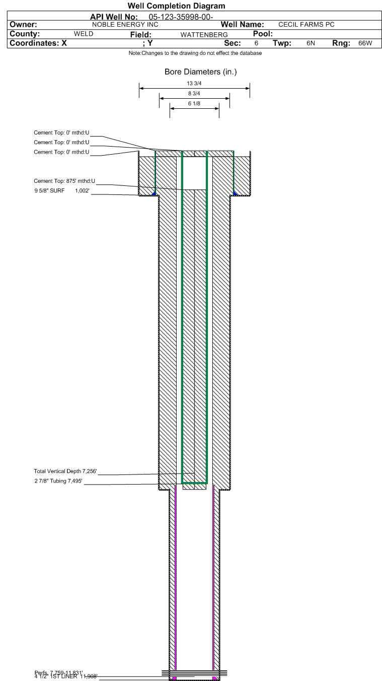 Wellbore #00 Wellbore Classification: OW Status: PA - 6/3/2019 Measured TD: 11923 ft. Vertical TD: 7256 ft.| Wellbore Data for Original Wellbore | Wellbore Classification: OW PA - 6/3/2019 | | Wellbore Permit | HORIZONTAL | | Permit #: | | Expiration Date: | 8/21/2014 | | Proposed Top PZ Location: | Sec:6 Twp: 6N 66W | Footage: 993 FNL 794 FEL | | Bottom Hole Location: | Sec:6 Twp: 6N 66W | Footage: 990 FNL 535 FWL | | Proposed Depth/Form: | 11668 ft. | | Surface Mineral Owner Same: | Yes | | Mineral Owner: | FEE | Surface Owner: | FEE | | Unit: | | Unit Number: | | | Formation And Spacing: | Code: NBRR , Formation: NIOBRARA , Order: , Unit Acreage: 320, Drill Unit: GWA | | Casing: | String Type: CONDUCTOR, Hole Size: 18.5 in., Size: 16 in., Top: 0 ft., Depth: 100 ft., Weight: , Citings Type: PLANNED | | Cement: | Sacks: 6, Top: 0 ft., Bottom: 100 ft. | | Casing: | String Type: SURF, Hole Size: 13.75 in., Size: 9.625 in., Top: 0 ft., Depth: 910 ft., Weight: 36 , Citings Type: PLANNED | | Cement: | Sacks: 419, Top: 0 ft., Bottom: 910 ft. | | Casing: | String Type: 1ST, Hole Size: 8.75 in., Size: 7 in., Top: 0 ft., Depth: 7605 ft., Weight: 26 , Citings Type: PLANNED | | Cement: | Sacks: 532, Top: 0 ft., Bottom: 7605 ft. | | Casing: | String Type: 1ST LINER, Hole Size: 6.125 in., Size: 4.5 in., Top: 7500 ft., Depth: 11668 ft., Weight: 11.6 , Citings Type: PLANNED | | Cement: | Sacks: , Top: 0 ft., Bottom: |