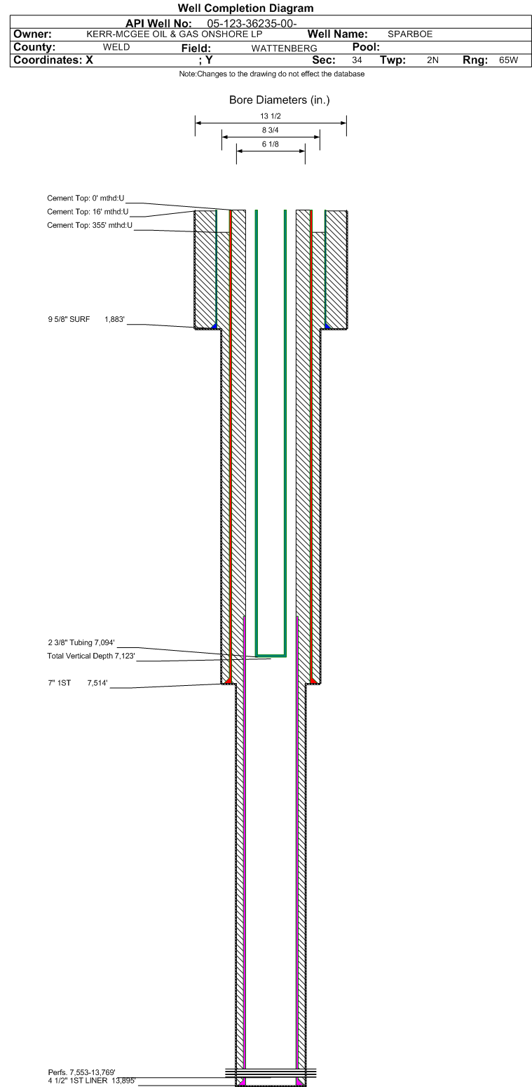 | Wellbore Completed | | Completion Date: | 2/10/2013 | | Spud Date: | 12/11/2012 | Spud Date Is: | ACTUAL | | Measured TD: | 13900 ft. | Measured PB depth: | 13801 ft. | | True Vertical TD: | 7123 ft. | True Vertical PB depth: | 7113 ft. | | Top PZ Location: | Sec:34 Twp: 2N 65W | Footage: 1073 FNL 2036 FEL | | Bottom Hole Location: | Sec:3 Twp: 1N 65W | Footage: 2125 FNL 1987 FEL | | Log Types: | PRE FORM 5 | | Log Types: | GR/RES/MUD | | Casing: | String Type: SURF, Hole Size: 13.5 in., Size: 9.625 in., Top: 0 ft., Depth: 1883 ft., Weight: 36.0 , Citings Type: ACTUAL | | Cement: | Sacks: 654, Top: 16 ft., Bottom: 1883 ft., Determination Method: CALC | | Casing: | String Type: 1ST, Hole Size: 8.75 in., Size: 7 in., Top: 0 ft., Depth: 7514 ft., Weight: 26.0 , Citings Type: ACTUAL | | Cement: | Sacks: 690, Top: 355 ft., Bottom: 7514 ft., Determination Method: CBL | | Casing: | String Type: 1ST LINER, Hole Size: 6.125 in., Size: 4.5 in., Top: 6448 ft., Depth: 13895 ft., Weight: 11.6 , Citings Type: ACTUAL | | Cement: | Sacks: , Top: , Bottom: , Determination Method: CALC | | Formation | Interval Top | Log Bottom | Cored | DSTs | | SHARON SPRINGS | 7110 ft. | | | | | NIOBRARA | 7338 ft. | | | |