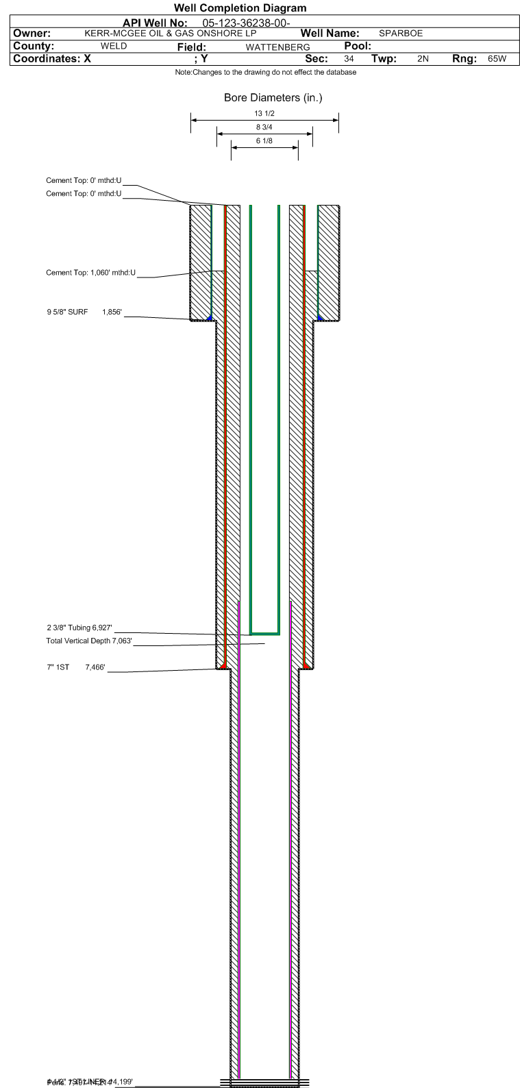 | Wellbore Completed | | Completion Date: | 2/15/2013 | | Spud Date: | 11/28/2012 | Spud Date Is: | ACTUAL | | Measured TD: | 14214 ft. | Measured PB depth: | 1490 ft. | | True Vertical TD: | 7063 ft. | True Vertical PB depth: | 7063 ft. | | Top PZ Location: | Sec:34 Twp: 2N 65W | Footage: 718 FNL 763 FEL | | Bottom Hole Location: | Sec:3 Twp: 1N 65W | Footage: 2107 FNL 751 FEL | | Log Types: | PRE FORM 5 | | Log Types: | GR/GR-RES/MUD | | Casing: | String Type: SURF, Hole Size: 13.5 in., Size: 9.625 in., Top: 0 ft., Depth: 1856 ft., Weight: 36.0 , Citings Type: ACTUAL | | Cement: | Sacks: 805, Top: 0 ft., Bottom: 1856 ft., Determination Method: CALC | | Casing: | String Type: 1ST, Hole Size: 8.75 in., Size: 7 in., Top: 0 ft., Depth: 7466 ft., Weight: 26.0 , Citings Type: ACTUAL | | Cement: | Sacks: 639, Top: 1060 ft., Bottom: 7466 ft., Determination Method: CBL | | Casing: | String Type: 1ST LINER, Hole Size: 6.125 in., Size: 4.5 in., Top: 6379 ft., Depth: 14199 ft., Weight: 11.6 , Citings Type: ACTUAL | | Cement: | Sacks: , Top: , Bottom: , Determination Method: | | Formation | Interval Top | Log Bottom | Cored | DSTs | | SHARON SPRINGS | 7027 ft. | | | | | NIOBRARA | 7255 ft. | | | |