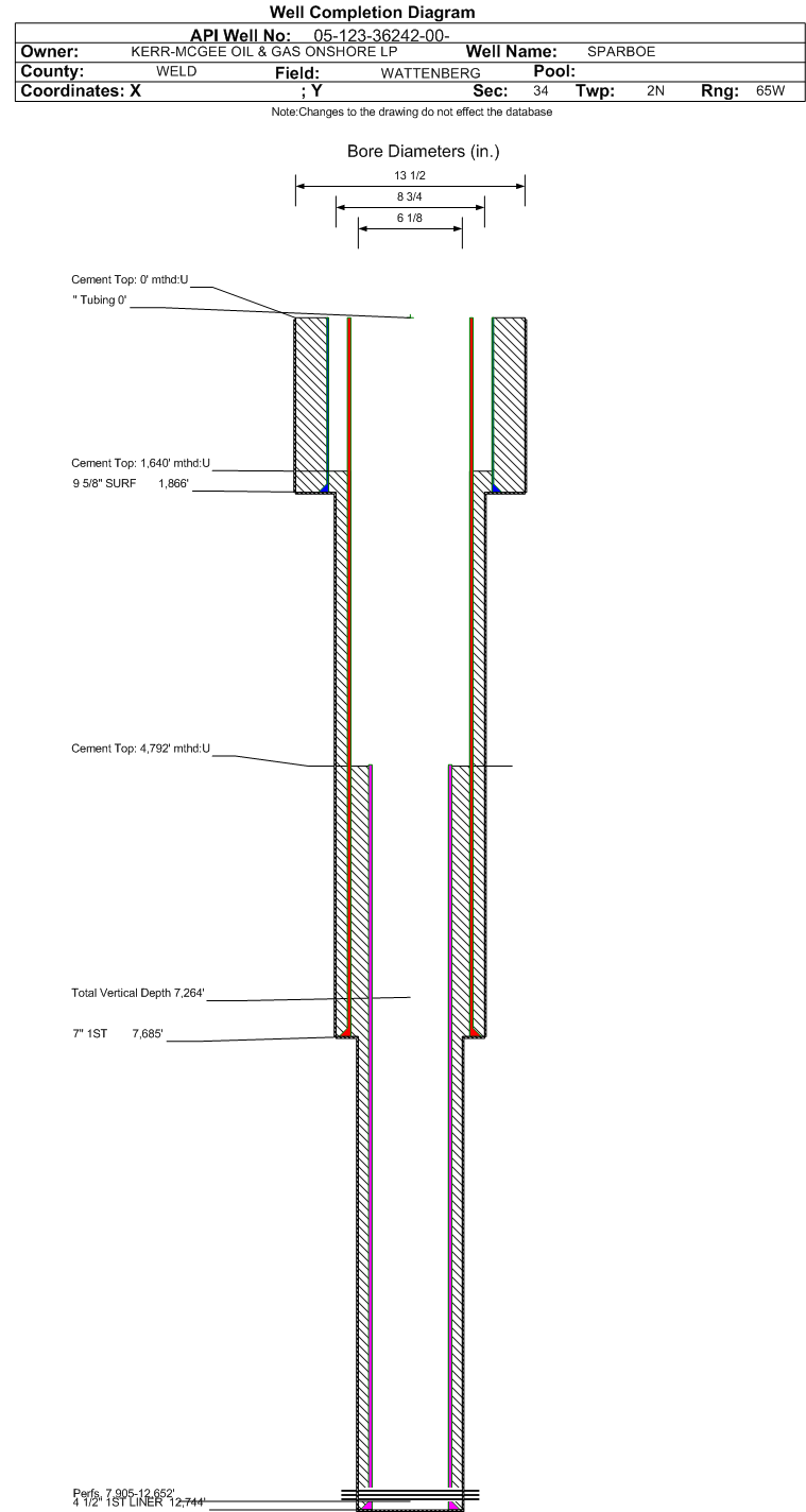 | Wellbore Completed | | Completion Date: | 1/21/2013 | | Spud Date: | 12/13/2012 | Spud Date Is: | ACTUAL | | Measured TD: | 14488 ft. | Measured PB depth: | 12696 ft. | | True Vertical TD: | 7264 ft. | True Vertical PB depth: | 7273 ft. | | Top PZ Location: | Sec:34 Twp: 2N 65W | Footage: 653 FNL 2312 FEL | | Bottom Hole Location: | Sec:3 Twp: 1N 65W | Footage: 2134 FNL 2300 FEL | | Log Types: | PRE FORM 5 | | Log Types: | GR/RES/MUD | | Casing: | String Type: SURF, Hole Size: 13.5 in., Size: 9.625 in., Top: 0 ft., Depth: 1866 ft., Weight: 36.0 , Citings Type: ACTUAL | | Cement: | Sacks: 652, Top: 0 ft., Bottom: 1866 ft., Determination Method: CALC | | Casing: | String Type: 1ST, Hole Size: 8.75 in., Size: 7 in., Top: 0 ft., Depth: 7685 ft., Weight: 26.0 , Citings Type: ACTUAL | | Cement: | Sacks: 640, Top: 1640 ft., Bottom: 7685 ft., Determination Method: CBL | | Casing: | String Type: 1ST LINER, Hole Size: 6.125 in., Size: 4.5 in., Top: 4777 ft., Depth: 12744 ft., Weight: 11.6 , Citings Type: ACTUAL | | Cement: | Sacks: 426, Top: 4792 ft., Bottom: 12744 ft., Determination Method: | | Formation | Interval Top | Log Bottom | Cored | DSTs | | SHARON SPRINGS | 7016 ft. | | | | | NIOBRARA | 7113 ft. | | | | | FORT HAYS | 7511 ft. | | | | | CODELL | 7621 ft. | | | |