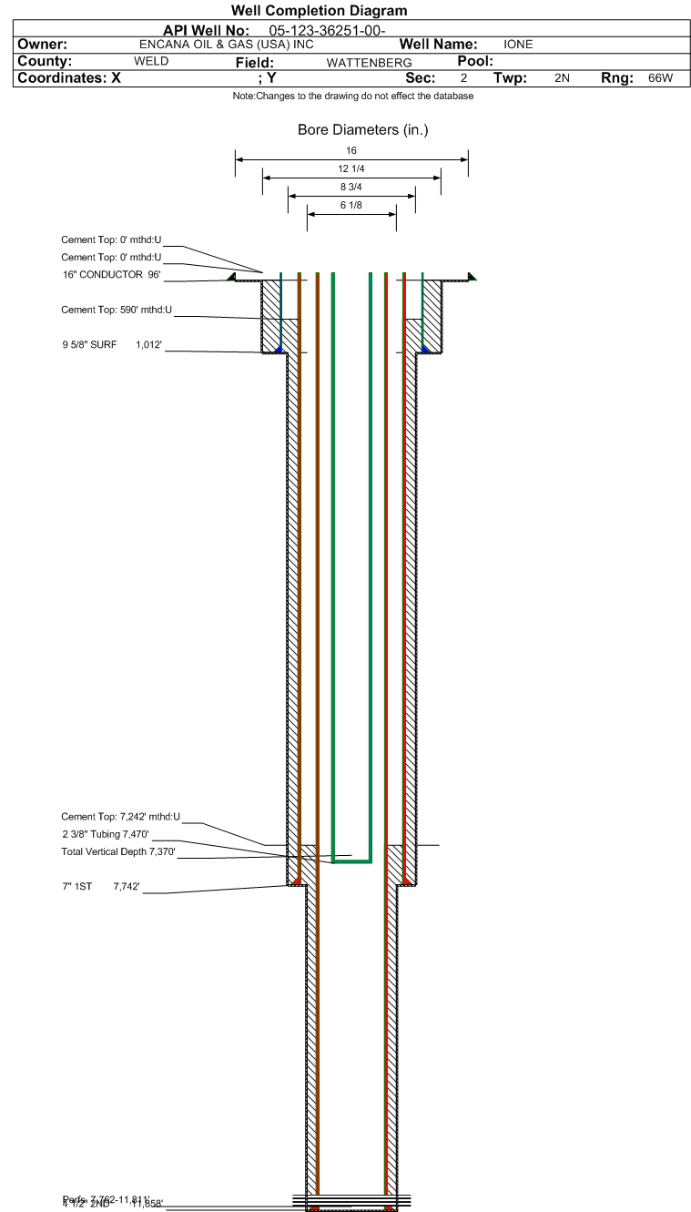 Wellbore #00 Wellbore Classification: OW Status: PR - 8/15/2022 Measured TD: 11873 ft. Vertical TD: 7370 ft.| Wellbore Data for Original Wellbore | Wellbore Classification: OW PR - 8/15/2022 | | Wellbore Permit | HORIZONTAL | | Permit #: | | Expiration Date: | 10/30/2014 | | Proposed Top PZ Location: | Sec:2 Twp: 2N 66W | Footage: 646 FNL 298 FWL | | Bottom Hole Location: | Sec:2 Twp: 2N 66W | Footage: 502 FSL 243 FWL | | Proposed Depth/Form: | 11947 ft. | | Surface Mineral Owner Same: | Yes | | Mineral Owner: | FEE | Surface Owner: | FEE | | Unit: | | Unit Number: | | | Formation And Spacing: | Code: NBRR , Formation: NIOBRARA , Order: , Unit Acreage: 320, Drill Unit: GWA | | Casing: | String Type: CONDUCTOR, Hole Size: 22 in., Size: 16 in., Top: 0 ft., Depth: 80 ft., Weight: 30 , Citings Type: PLANNED | | Cement: | Sacks: 80, Top: 0 ft., Bottom: 80 ft. | | Casing: | String Type: SURF, Hole Size: 12.25 in., Size: 9.625 in., Top: 0 ft., Depth: 884 ft., Weight: 40 , Citings Type: PLANNED | | Cement: | Sacks: 241, Top: 0 ft., Bottom: 884 ft. | | Casing: | String Type: 1ST, Hole Size: 8.75 in., Size: 7 in., Top: 0 ft., Depth: 7727 ft., Weight: 26 , Citings Type: PLANNED | | Cement: | Sacks: 947, Top: 584 ft., Bottom: 7727 ft. | | Casing: | String Type: 2ND, Hole Size: 6.125 in., Size: 4.5 in., Top: 0 ft., Depth: 11947 ft., Weight: 13.5 , Citings Type: PLANNED | | Cement: | Sacks: 373, Top: 7427 ft., Bottom: 11947 ft. |