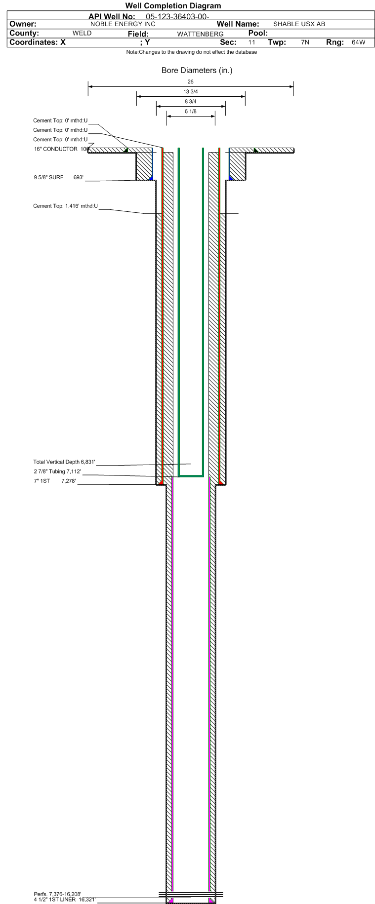 | Wellbore Completed | | Completion Date: | 6/28/2013 | | Spud Date: | 6/10/2013 | Spud Date Is: | ACTUAL | | Measured TD: | 16339 ft. | Measured PB depth: | 16339 ft. | | True Vertical TD: | 6831 ft. | True Vertical PB depth: | 6831 ft. | | Top PZ Location: | Sec:11 Twp: 7N 64W | Footage: 2332 FSL 1111 FWL | | Bottom Hole Location: | Sec:12 Twp: 7N 64W | Footage: 2318 FSL 354 FEL | | Log Types: | CBL/Mud/Gamma | | Casing: | String Type: CONDUCTOR, Hole Size: 26 in., Size: 16 in., Top: 0 ft., Depth: 100 ft., Weight: 84 , Citings Type: ACTUAL | | Cement: | Sacks: 64, Top: 0 ft., Bottom: 100 ft., Determination Method: VISU | | Casing: | String Type: SURF, Hole Size: 13.75 in., Size: 9.625 in., Top: 0 ft., Depth: 693 ft., Weight: 36 , Citings Type: ACTUAL | | Cement: | Sacks: 424, Top: 0 ft., Bottom: 693 ft., Determination Method: VISU | | Casing: | String Type: 1ST, Hole Size: 8.75 in., Size: 7 in., Top: 0 ft., Depth: 7278 ft., Weight: 26 , Citings Type: ACTUAL | | Cement: | Sacks: 600, Top: 1416 ft., Bottom: 7278 ft., Determination Method: CBL | | Casing: | String Type: 1ST LINER, Hole Size: 6.125 in., Size: 4.5 in., Top: 7113 ft., Depth: 16321 ft., Weight: 11.6 , Citings Type: ACTUAL | | Cement: | Sacks: , Top: , Bottom: , Determination Method: | | Formation | Interval Top | Log Bottom | Cored | DSTs | | PIERRE | 1153 ft. | | | | | PARKMAN | 3735 ft. | | | | | SUSSEX | 4350 ft. | | | | | SHANNON | 5138 ft. | | | | | NIOBRARA | 6862 ft. | | | |
