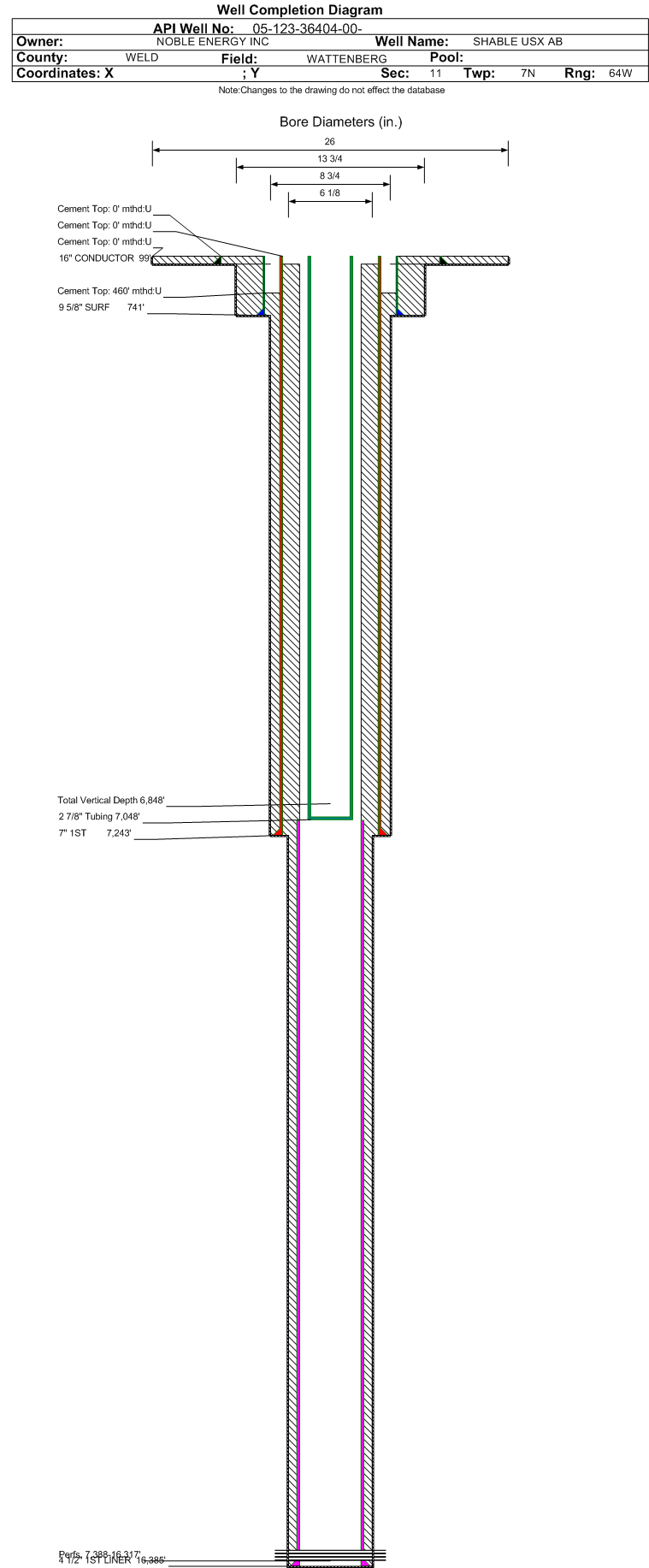 | Wellbore Completed | | Completion Date: | 8/8/2013 | | Spud Date: | 7/17/2013 | Spud Date Is: | ACTUAL | | Measured TD: | 16395 ft. | Measured PB depth: | 16395 ft. | | True Vertical TD: | 6848 ft. | True Vertical PB depth: | 6848 ft. | | Top PZ Location: | Sec:11 Twp: 7N 64W | Footage: 1643 FSL 1049 FWL | | Bottom Hole Location: | Sec:12 Twp: 7N 64W | Footage: 1583 FSL 546 FEL | | Log Types: | CBL/Mud/Gamma | | Casing: | String Type: CONDUCTOR, Hole Size: 26 in., Size: 16 in., Top: 0 ft., Depth: 99 ft., Weight: 84 , Citings Type: ACTUAL | | Cement: | Sacks: 64, Top: 0 ft., Bottom: 99 ft., Determination Method: VISU | | Casing: | String Type: SURF, Hole Size: 13.75 in., Size: 9.625 in., Top: 0 ft., Depth: 741 ft., Weight: 36 , Citings Type: ACTUAL | | Cement: | Sacks: 463, Top: 0 ft., Bottom: 741 ft., Determination Method: VISU | | Casing: | String Type: 1ST, Hole Size: 8.75 in., Size: 7 in., Top: 0 ft., Depth: 7243 ft., Weight: 26 , Citings Type: ACTUAL | | Cement: | Sacks: 568, Top: 460 ft., Bottom: 7243 ft., Determination Method: CBL | | Casing: | String Type: 1ST LINER, Hole Size: 6.125 in., Size: 4.5 in., Top: 7056 ft., Depth: 16385 ft., Weight: 11.6 , Citings Type: ACTUAL | | Cement: | Sacks: , Top: , Bottom: , Determination Method: | | Formation | Interval Top | Log Bottom | Cored | DSTs | | PIERRE | 1159 ft. | | | | | PARKMAN | 3720 ft. | | | | | SUSSEX | 4418 ft. | | | | | SHANNON | 5150 ft. | | | | | NIOBRARA | 6828 ft. | | | |
