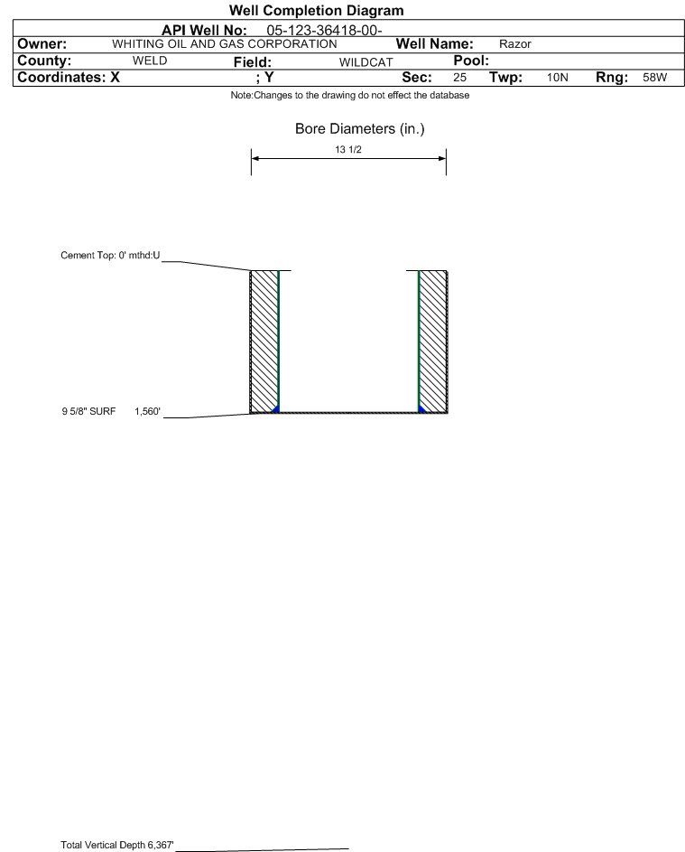 Wellbore #00 Wellbore Classification: OW Status: DG - 3/2/2013 Measured TD: 6368 ft. Vertical TD: 6367 ft.| Wellbore Data for Original Wellbore | Wellbore Classification: OW DG - 3/2/2013 | | Wellbore Permit | HORIZONTAL | | Permit #: | | Expiration Date: | 12/17/2014 | | Proposed Top PZ Location: | Sec:25 Twp: 10N 58W | Footage: 838 671 | | Bottom Hole Location: | Sec:25 Twp: 10N 58W | Footage: 314 660 | | Proposed Depth/Form: | 9820 ft. | | Surface Mineral Owner Same: | Yes | | Mineral Owner: | FEE | Surface Owner: | FEE | | Unit: | | Unit Number: | | | Formation And Spacing: | Code: NBRR , Formation: NIOBRARA , Order: 535-3 , Unit Acreage: 640, Drill Unit: all of Sect 25 | | Casing: | String Type: CONDUCTOR, Hole Size: 20 in., Size: 20 in., Top: 0 ft., Depth: 80 ft., Weight: , Citings Type: PLANNED | | Cement: | Sacks: , Top: , Bottom: | | Casing: | String Type: SURF, Hole Size: 13.5 in., Size: 9.625 in., Top: 0 ft., Depth: 1550 ft., Weight: 36 , Citings Type: PLANNED | | Cement: | Sacks: 743, Top: 0 ft., Bottom: 1550 ft. | | Casing: | String Type: 1ST, Hole Size: 8.75 in., Size: 7 in., Top: 0 ft., Depth: 5996 ft., Weight: 29 , Citings Type: PLANNED | | Cement: | Sacks: 419, Top: 0 ft., Bottom: 5996 ft. | | Casing: | String Type: 2ND, Hole Size: 6 in., Size: 4.5 in., Top: 5178 ft., Depth: 9820 ft., Weight: 11.6 , Citings Type: PLANNED | | Cement: | Sacks: , Top: , Bottom: |