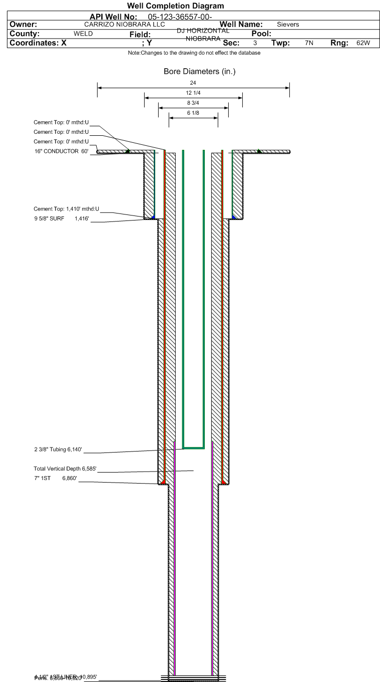 | Wellbore Completed | | Completion Date: | 5/18/2013 | | Spud Date: | 5/7/2013 | Spud Date Is: | ACTUAL | | Measured TD: | 10920 ft. | Measured PB depth: | 10845 ft. | | True Vertical TD: | 6585 ft. | True Vertical PB depth: | 6583 ft. | | Top PZ Location: | Sec:3 Twp: 7N 62W | Footage: 591 FSL 640 FEL | | Bottom Hole Location: | Sec:3 Twp: 7N 62W | Footage: 652 FNL 674 FEL | | Log Types: | MWD, CBL | | Casing: | String Type: CONDUCTOR, Hole Size: 24 in., Size: 16 in., Top: 0 ft., Depth: 60 ft., Weight: 36.9 , Citings Type: ACTUAL | | Cement: | Sacks: 8, Top: 0 ft., Bottom: 60 ft., Determination Method: VISU | | Casing: | String Type: SURF, Hole Size: 12.25 in., Size: 9.625 in., Top: 0 ft., Depth: 1416 ft., Weight: 36 , Citings Type: ACTUAL | | Cement: | Sacks: 653, Top: 0 ft., Bottom: 1416 ft., Determination Method: VISU | | Casing: | String Type: 1ST, Hole Size: 8.75 in., Size: 7 in., Top: 0 ft., Depth: 6860 ft., Weight: 23 , Citings Type: ACTUAL | | Cement: | Sacks: 595, Top: 1410 ft., Bottom: 6860 ft., Determination Method: CBL | | Casing: | String Type: 1ST LINER, Hole Size: 6.125 in., Size: 4.5 in., Top: 5977 ft., Depth: 10895 ft., Weight: 11.6 , Citings Type: ACTUAL | | Cement: | Sacks: , Top: , Bottom: , Determination Method: | | Formation | Interval Top | Log Bottom | Cored | DSTs | | SHARON SPRINGS | 6450 ft. | 6572 ft. | N | N | | NIOBRARA | 6572 ft. | | N | N |