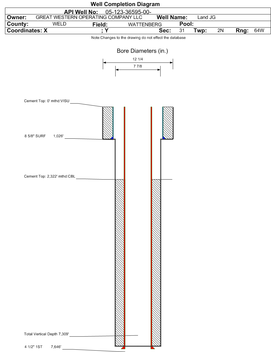 Wellbore #00 Wellbore Classification: OW Status: PA - 11/2/2021 Measured TD: 7688 ft. Vertical TD: 7309 ft.| Wellbore Data for Original Wellbore | Wellbore Classification: OW PA - 11/2/2021 | | Wellbore Permit | DIRECTIONAL | | Permit #: | | Expiration Date: | 1/16/2015 | | Proposed Top PZ Location: | Sec:31 Twp: 2N 67W | Footage: 1373 FSL 2477 FWL | | Bottom Hole Location: | Sec:31 Twp: 2N 67W | Footage: 1373 FSL 2477 FWL | | Proposed Depth/Form: | 7729 ft. | | Surface Mineral Owner Same: | No | | Mineral Owner: | FEE | Surface Owner: | FEE | | Unit: | | Unit Number: | | | Formation And Spacing: | Code: NB-CD , Formation: NIOBRARA-CODELL , Order: 407-87 , Unit Acreage: 160, Drill Unit: GWA | | Casing: | String Type: SURF, Hole Size: 12.25 in., Size: 8.625 in., Top: 0 ft., Depth: 1005 ft., Weight: 24 , Citings Type: PLANNED | | Cement: | Sacks: 464, Top: 0 ft., Bottom: 1005 ft. | | Casing: | String Type: 1ST, Hole Size: 7.875 in., Size: 4.5 in., Top: 0 ft., Depth: 7729 ft., Weight: 11.6 , Citings Type: PLANNED | | Cement: | Sacks: 683, Top: 4078 ft., Bottom: 7729 ft. |
