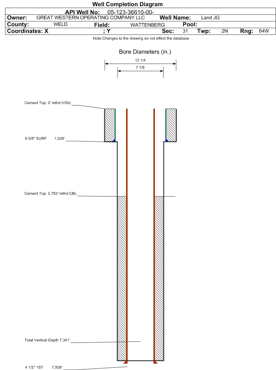 Wellbore #00 Wellbore Classification: OW Status: AB - 9/3/2024 Measured TD: 7978 ft. Vertical TD: 7341 ft.| Wellbore Data for Original Wellbore | Wellbore Classification: OW AB - 9/3/2024 | | Wellbore Permit | DIRECTIONAL | | Permit #: | | Expiration Date: | 1/24/2015 | | Proposed Top PZ Location: | Sec:31 Twp: 2N 64W | Footage: 2693 FSL 0 FWL | | Bottom Hole Location: | Sec:31 Twp: 2N 64W | Footage: 2693 FSL 0 FWL | | Proposed Depth/Form: | 7988 ft. | | Surface Mineral Owner Same: | No | | Mineral Owner: | FEE | Surface Owner: | FEE | | Unit: | | Unit Number: | | | Formation And Spacing: | Code: NB-CD , Formation: NIOBRARA-CODELL , Order: , Unit Acreage: 160, Drill Unit: GWA | | Casing: | String Type: SURF, Hole Size: 12.25 in., Size: 8.625 in., Top: 0 ft., Depth: 1009 ft., Weight: 24 , Citings Type: PLANNED | | Cement: | Sacks: 466, Top: 0 ft., Bottom: 1009 ft. | | Casing: | String Type: 1ST, Hole Size: 7.875 in., Size: 4.5 in., Top: 0 ft., Depth: 7988 ft., Weight: 11.6 , Citings Type: PLANNED | | Cement: | Sacks: 700, Top: 4247 ft., Bottom: 7988 ft. |
