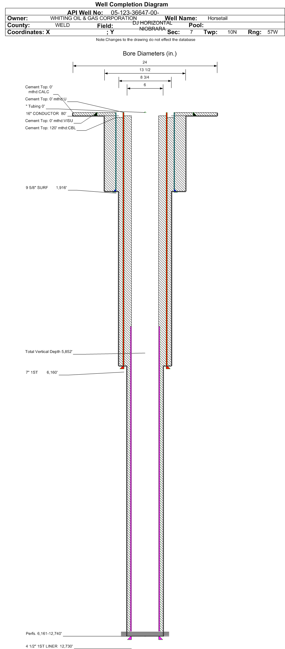 | Wellbore Completed | | Completion Date: | 5/30/2013 | | Spud Date: | 5/20/2013 | Spud Date Is: | ACTUAL | | Measured TD: | 12740 ft. | Measured PB depth: | 12740 ft. | | True Vertical TD: | 5852 ft. | True Vertical PB depth: | 5852 ft. | | Top PZ Location: | Sec:7 Twp: 10N 57W | Footage: 1924 FNL 651 FWL | | Bottom Hole Location: | Sec:6 Twp: 10N 57W | Footage: 670 FNL 659 FWL | | Log Types: | GR, Mud, RCBL | | Casing: | String Type: CONDUCTOR, Hole Size: 24 in., Size: 16 in., Top: 0 ft., Depth: 80 ft., Weight: 32 , Citings Type: ACTUAL | | Cement: | Sacks: , Top: 0 ft., Bottom: 80 ft., Determination Method: CALC | | Casing: | String Type: SURF, Hole Size: 13.5 in., Size: 9.625 in., Top: 0 ft., Depth: 1916 ft., Weight: 36 , Citings Type: ACTUAL | | Cement: | Sacks: 884, Top: 0 ft., Bottom: 1916 ft., Determination Method: VISU | | Casing: | String Type: 1ST, Hole Size: 8.75 in., Size: 7 in., Top: 0 ft., Depth: 6160 ft., Weight: 29 , Citings Type: ACTUAL | | Cement: | Sacks: 436, Top: 120 ft., Bottom: 6160 ft., Determination Method: CBL | | Casing: | String Type: 1ST LINER, Hole Size: 6 in., Size: 4.5 in., Top: 5195 ft., Depth: 12730 ft., Weight: 11.6 , Citings Type: ACTUAL | | Cement: | Sacks: , Top: , Bottom: , Determination Method: | | Formation | Interval Top | Log Bottom | Cored | DSTs | | PIERRE | 1710 ft. | | N | N | | HYGIENE | 3612 ft. | | N | N | | SHARON SPRINGS | 5759 ft. | | N | N | | NIOBRARA | 5766 ft. | | N | N |