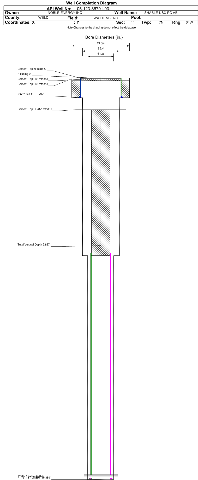 | Wellbore Completed | | Completion Date: | 6/7/2013 | | Spud Date: | 5/20/2013 | Spud Date Is: | ACTUAL | | Measured TD: | 16399 ft. | Measured PB depth: | 16380 ft. | | True Vertical TD: | 6837 ft. | True Vertical PB depth: | 6837 ft. | | Top PZ Location: | Sec:11 Twp: 7N 64W | Footage: 1005 FSL 836 FWL | | Bottom Hole Location: | Sec:12 Twp: 7N 64W | Footage: 990 FSL 535 FEL | | Log Types: | CBL/Mud/Gamma