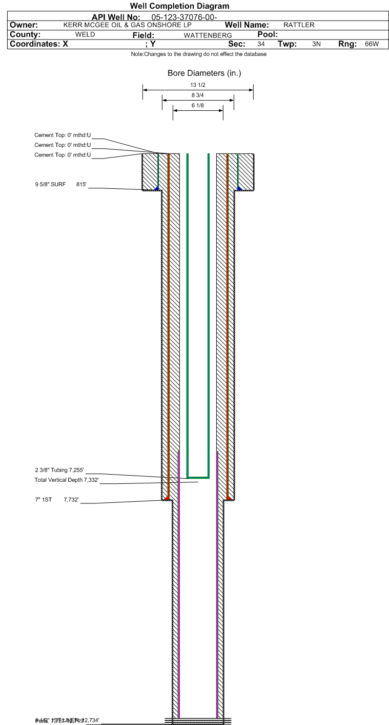Wellbore #00 Wellbore Classification: OW Status: PR - 11/25/2013 Measured TD: 12749 ft. Vertical TD: 7332 ft.| Wellbore Data for Original Wellbore | Wellbore Classification: OW PR - 11/25/2013 | | Wellbore Permit | HORIZONTAL | | Permit #: | | Expiration Date: | 3/29/2015 | | Proposed Top PZ Location: | Sec:3 Twp: 2N 66W | Footage: 237 FNL 137 FWL | | Bottom Hole Location: | Sec:3 Twp: 2N 66W | Footage: 27 FSL 119 FWL | | Proposed Depth/Form: | 12832 ft. | | Surface Mineral Owner Same: | No | | Mineral Owner: | FEE | Surface Owner: | FEE | | Unit: | | Unit Number: | | | Formation And Spacing: | Code: NBRR , Formation: NIOBRARA , Order: , Unit Acreage: 480, Drill Unit: GWA | | Casing: | String Type: SURF, Hole Size: 13.5 in., Size: 9.625 in., Top: 0 ft., Depth: 800 ft., Weight: 36.0 , Citings Type: PLANNED | | Cement: | Sacks: 400, Top: 0 ft., Bottom: 800 ft. | | Casing: | String Type: 1ST, Hole Size: 8.75 in., Size: 7 in., Top: 0 ft., Depth: 7546 ft., Weight: 26.0 , Citings Type: PLANNED | | Cement: | Sacks: 750, Top: 0 ft., Bottom: 7545 ft. | | Casing: | String Type: 1ST LINER, Hole Size: 6.125 in., Size: 4.5 in., Top: 6490 ft., Depth: 12832 ft., Weight: 11.6 , Citings Type: PLANNED | | Cement: | Sacks: , Top: , Bottom: |