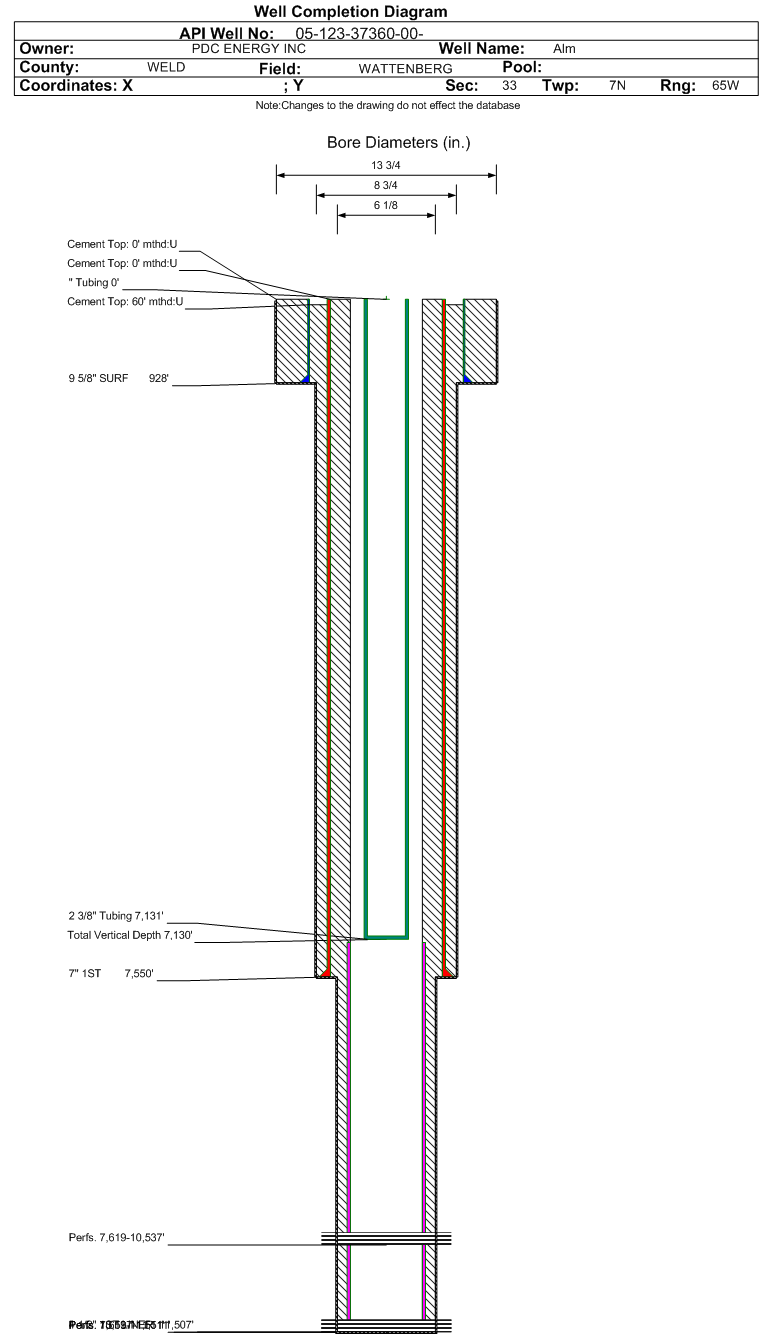 | Wellbore Completed | | Completion Date: | 3/20/2015 | | Spud Date: | 3/12/2015 | Spud Date Is: | ACTUAL | | Measured TD: | 11511 ft. | Measured PB depth: | 11504 ft. | | True Vertical TD: | 7130 ft. | True Vertical PB depth: | 7130 ft. | | Top PZ Location: | Sec:33 Twp: 7N 65W | Footage: 748 FNL 843 FEL | | Bottom Hole Location: | Sec:33 Twp: 7N 65W | Footage: 768 FNL 500 FWL | | Log Types: | CBL, MWD, (DIL in 123-23733) | | Casing: | String Type: SURF, Hole Size: 13.75 in., Size: 9.625 in., Top: 0 ft., Depth: 928 ft., Weight: 36 , Citings Type: ACTUAL | | Cement: | Sacks: 770, Top: 0 ft., Bottom: 928 ft., Determination Method: VISU | | Casing: | String Type: 1ST, Hole Size: 8.75 in., Size: 7 in., Top: 0 ft., Depth: 7550 ft., Weight: 26 , Citings Type: ACTUAL | | Cement: | Sacks: 700, Top: 60 ft., Bottom: 7550 ft., Determination Method: CBL | | Casing: | String Type: 1ST LINER, Hole Size: 6.125 in., Size: 4.5 in., Top: 7166 ft., Depth: 11507 ft., Weight: 13.5 , Citings Type: ACTUAL | | Cement: | Sacks: , Top: , Bottom: , Determination Method: | | Formation | Interval Top | Log Bottom | Cored | DSTs | | PARKMAN | 3735 ft. | | | | | SUSSEX | 4516 ft. | | | | | SHANNON | 5175 ft. | | | | | SHARON SPRINGS | 6671 ft. | | | | | NIOBRARA | 6853 ft. | | | | | FORT HAYS | 7550 ft. | | | | | CODELL | 7609 ft. | | | |
