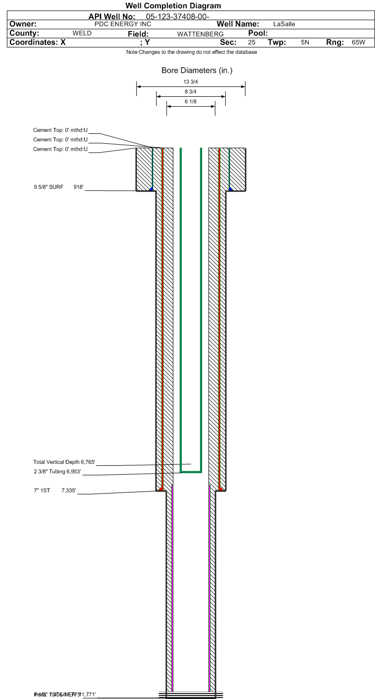 | Wellbore Completed | | Completion Date: | 11/23/2013 | | Spud Date: | 11/12/2013 | Spud Date Is: | ACTUAL | | Measured TD: | 11775 ft. | Measured PB depth: | 11767 ft. | | True Vertical TD: | 6765 ft. | True Vertical PB depth: | 6765 ft. | | Top PZ Location: | Sec:25 Twp: 5N 65W | Footage: 145 FNL 890 FWL | | Bottom Hole Location: | Sec:25 Twp: 5N 65W | Footage: 143 FNL 51 FEL | | Log Types: | CBL, MWD | | Casing: | String Type: SURF, Hole Size: 13.75 in., Size: 9.625 in., Top: 0 ft., Depth: 918 ft., Weight: 36 , Citings Type: ACTUAL | | Cement: | Sacks: 820, Top: 0 ft., Bottom: 918 ft., Determination Method: VISU | | Casing: | String Type: 1ST, Hole Size: 8.75 in., Size: 7 in., Top: 0 ft., Depth: 7335 ft., Weight: 26 , Citings Type: ACTUAL | | Cement: | Sacks: 610, Top: 0 ft., Bottom: 7335 ft., Determination Method: CBL | | Casing: | String Type: 1ST LINER, Hole Size: 6.125 in., Size: 4.5 in., Top: 7204 ft., Depth: 11771 ft., Weight: 13.5 , Citings Type: ACTUAL | | Cement: | Sacks: , Top: , Bottom: , Determination Method: | | Formation | Interval Top | Log Bottom | Cored | DSTs | | PARKMAN | 3624 ft. | | | | | SUSSEX | 4082 ft. | | | | | SHARON SPRINGS | 6644 ft. | | | | | NIOBRARA | 6852 ft. | | | |